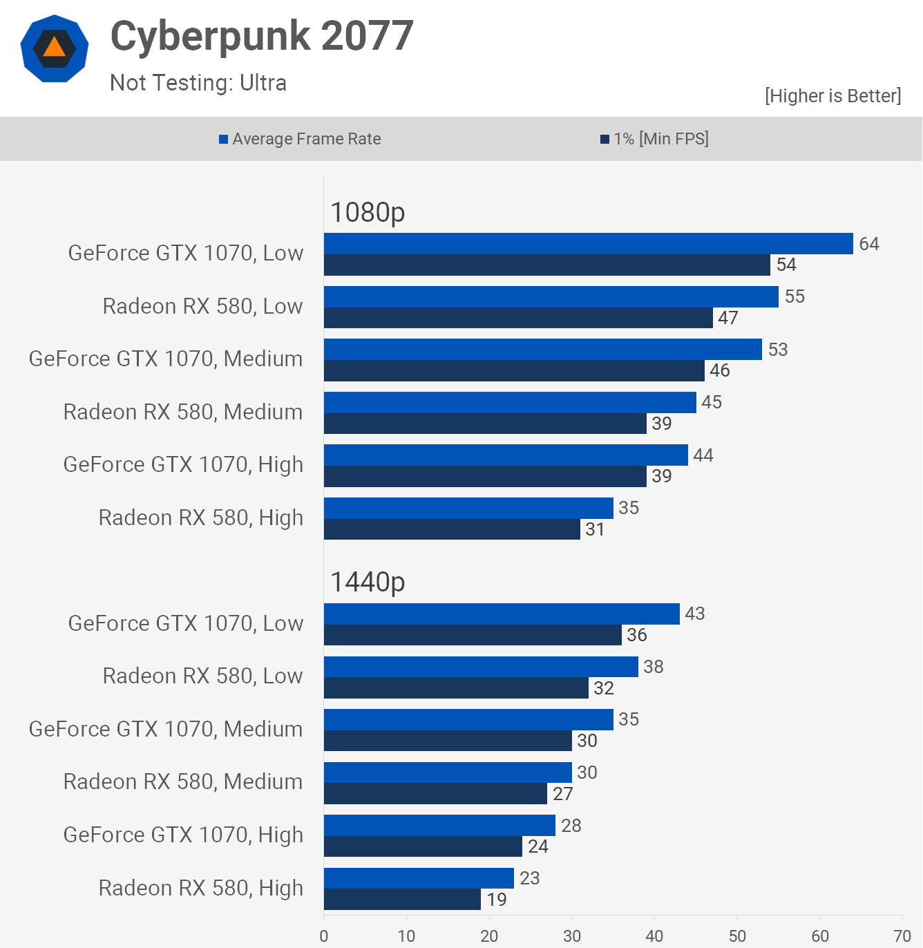 Now, Cyberpunk 2077 didn't play all that well on the RX 580 as the best we could achieve was 55 fps using the low quality preset. The GTX 1070 wasn't much better, but the 16% boost at 1080p using the low quality preset was welcomed as it did make the game noticeably smoother. Alternatively, you could aim for the same 50-ish frame rate but increase the visuals with the medium preset, so the GTX 1070 is a little more flexible here.