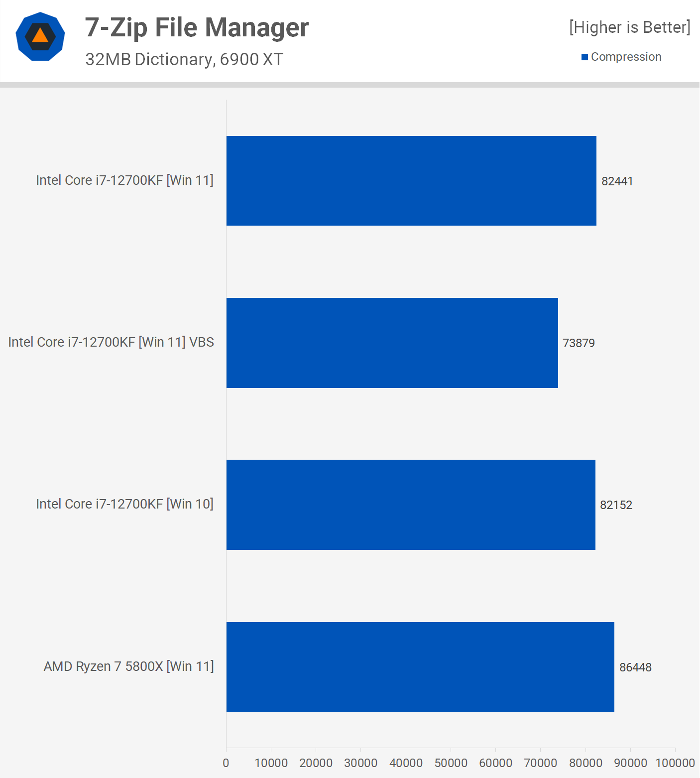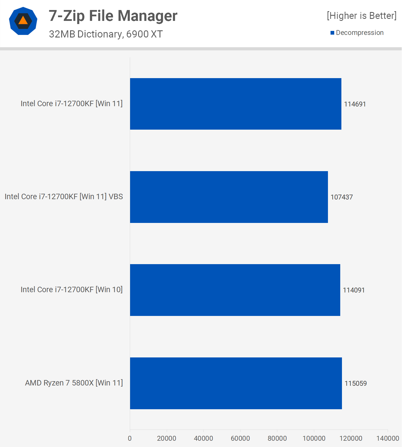 The 7-Zip file manager compression performance is similar between Windows 10 and Windows 11 again, with both OS running with VBS disabled. However, enabling VBS does reduce Windows 11 performance with the 12700KF by 10%.