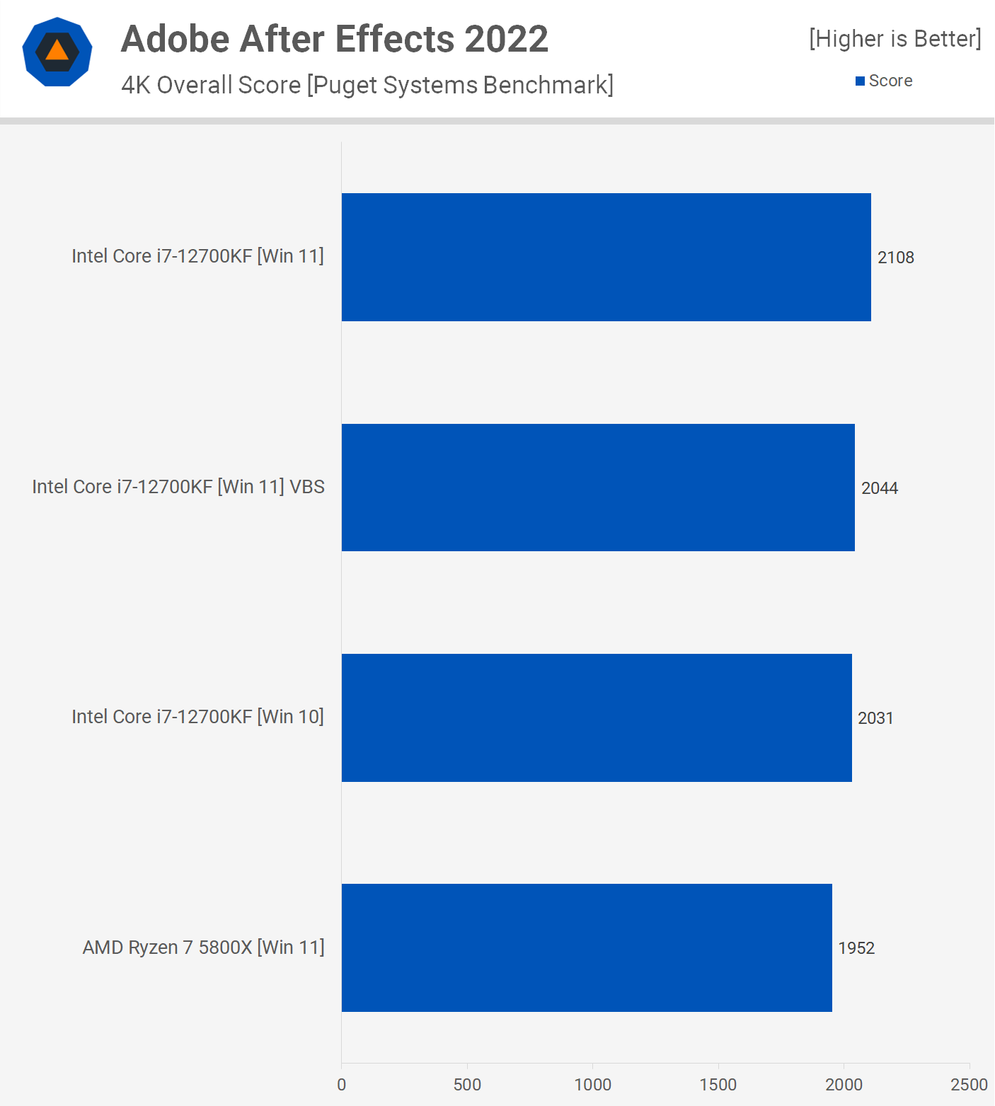 We have yet another example where Windows 11 is faster than 10 with Adobe After Effects 2022, this time by a 4% margin. VBS only reduced performance by 3% which is a negligible margin.