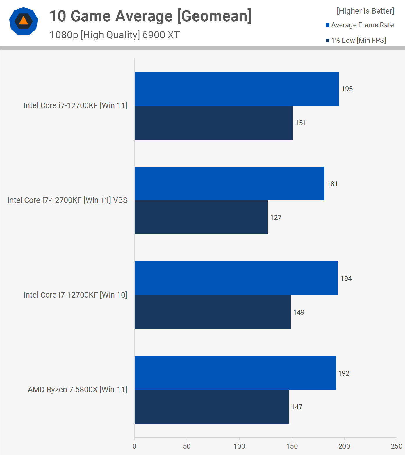 But of course, this is the best way to highlight CPU performance and the data is accurate. But it does mean under more GPU limited conditions, VBS might only reduce performance by around 5%, which is fairly negligible.