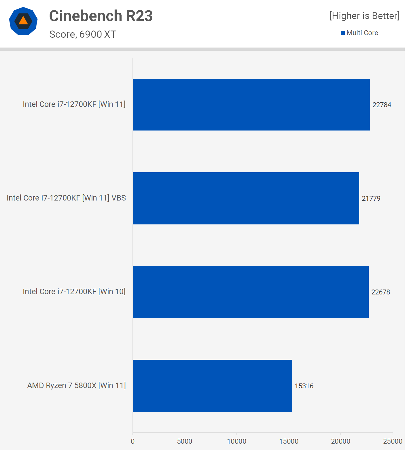 Starting with the Cinebench R23 multi-core results, we see that the difference between Windows 10 and Windows 11 is non-existent with both operating systems able to maximize the performance of Intel's latest Core i7 processor. That said, you will see around a 5% drop in performance with VBS enabled, which is not a massive difference, but it's worth being aware of.