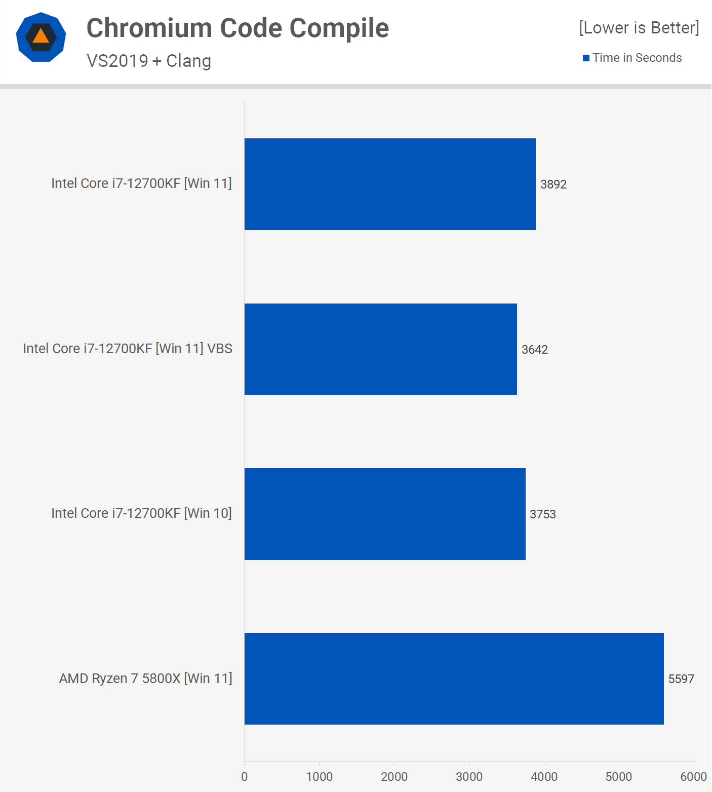We're looking at a 4% performance improvement for code compilation work using Windows 11 over 10, though enabling VBS did reduce performance by 6%. Minor margins in this one, but the performance trends are similar to the other application benchmarks.