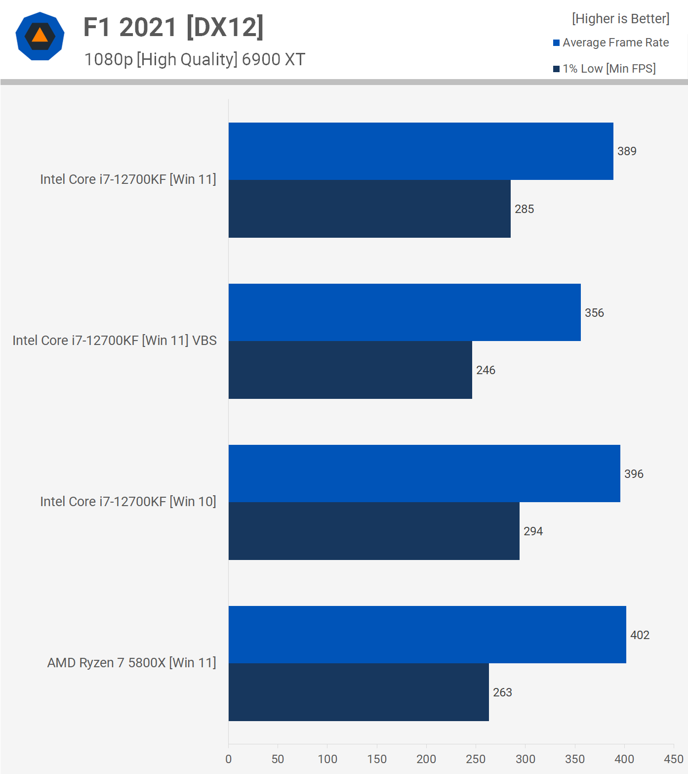 Time to check out gaming results, and as usual the game data is mixed, but we'll start with F1 2021. Here Windows 10 provided the best results, beating Windows 11 by a small 3% margin when comparing the 1% low data. However, enabling VBS tanks performance, reducing 1% low performance by up to 14%, which is a massive frame rate decline and something gamers should be aware of.