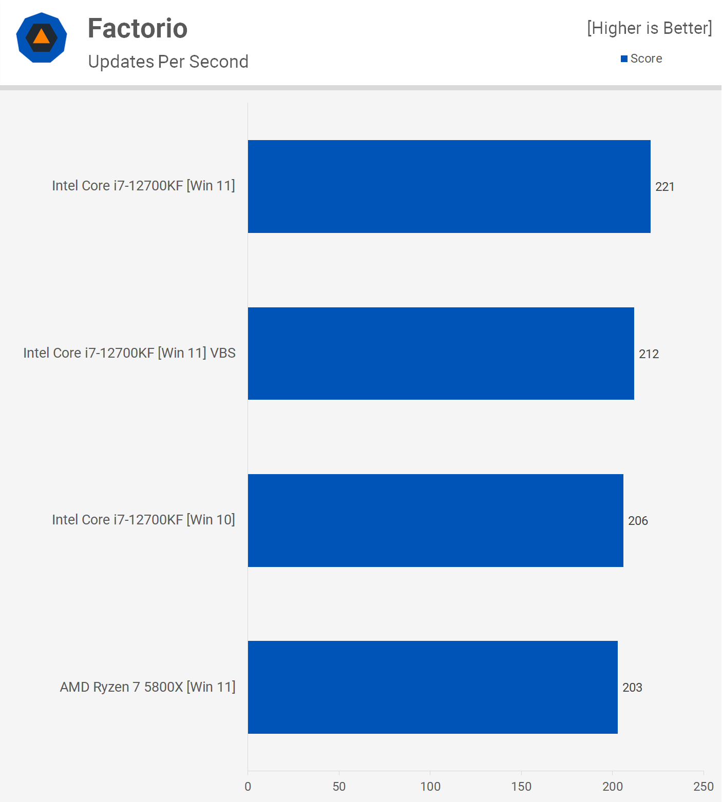 Windows 11 provided the best results in the Factorio benchmark, beating the previous version by 7%. It was also faster with VBS enabled, so overall a strong result for Microsoft's latest operating system.