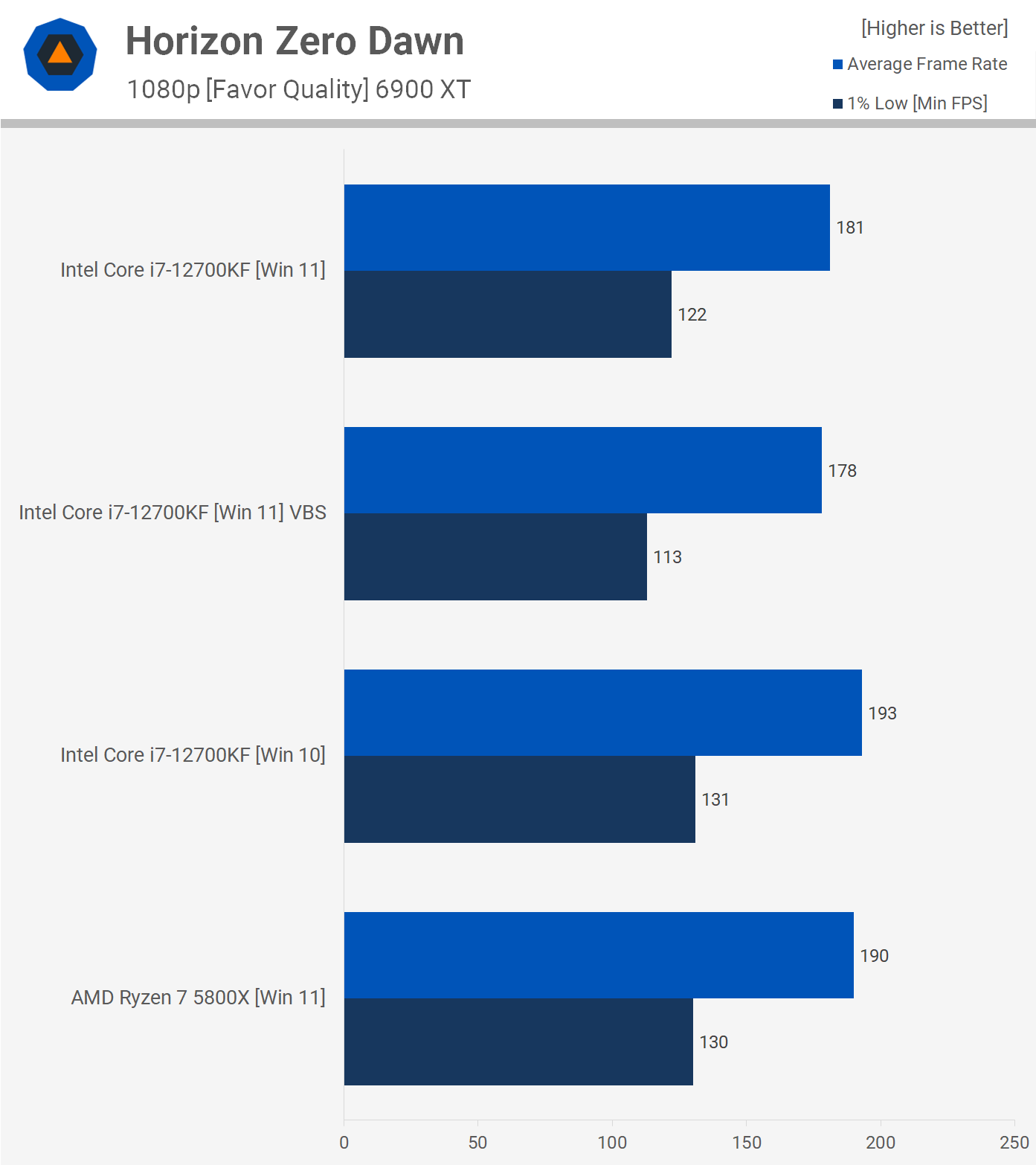 Horizon Zero Dawn outputs some peculiar results. Windows 10 outperforms Windows 11 by a 7% margin, in both average frame rates and 1% low. Enabling VBS dropped 1% low performance by a further 7%, though the average frame rate was only reduced by 1.5%. Either way, this was an unusually weak showing for Windows 11.