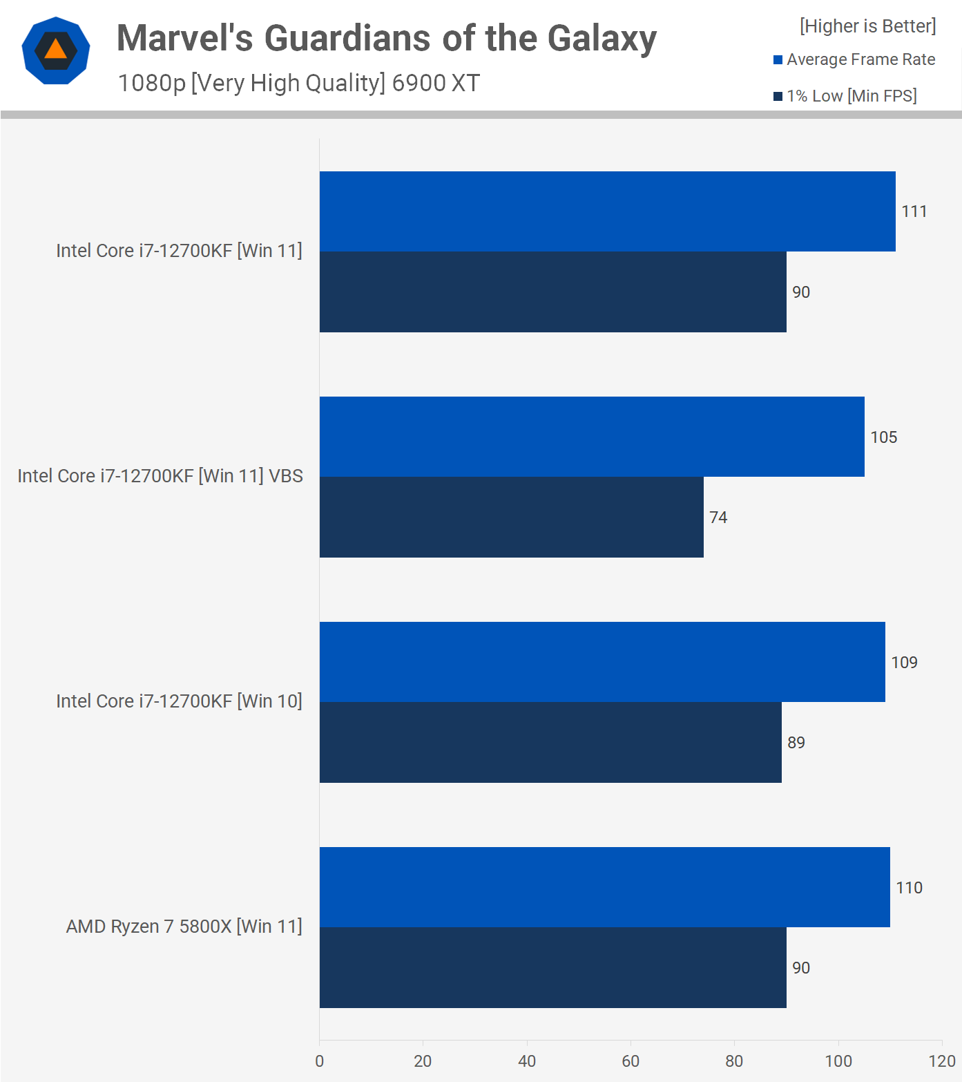 In Guardians of the Galaxy, Windows 11 and 10 are virtually the same. But enabling VBS does hurt gaming performance. While we're only looking at a 5% reduction in average frame rates, the 1% low dropped by a staggering 18%, not as extreme as Watch Dogs, but still significant.