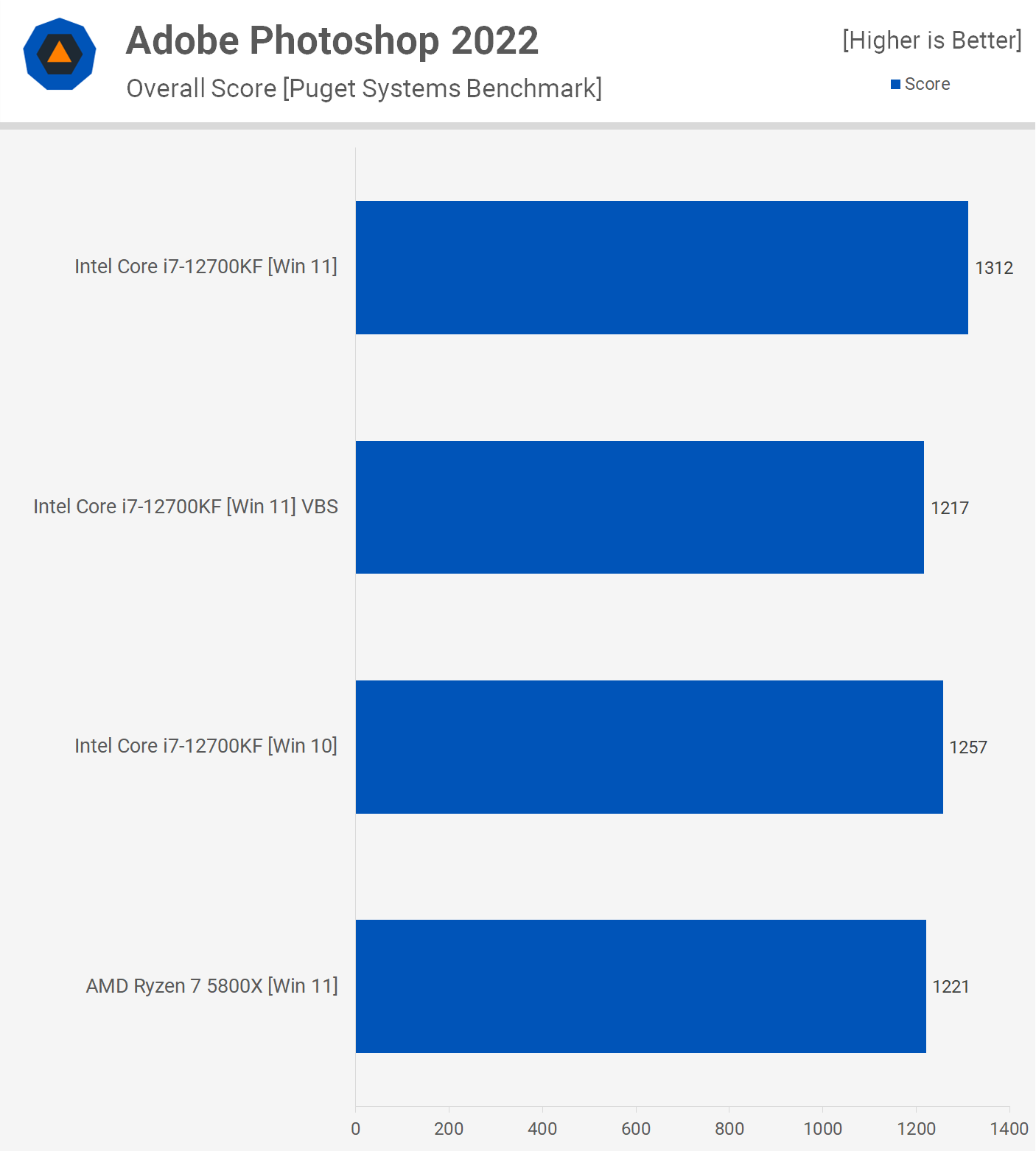 Windows 11 was also superior in Adobe Photoshop 2022, beating the previous OS by 4%. VBS did reduce performance by 7%, making it slower than Windows 10.