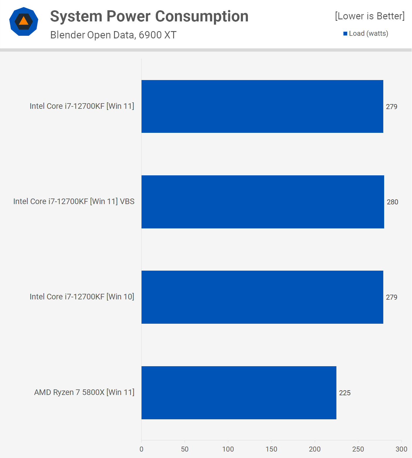 This is interesting to note, power usage between Windows 10 and 11 was identical, which makes sense given performance was also identical. However, despite slightly reducing performance, VBS doesn't reduce power consumption, at least in this example. So VBS enabled Windows 11 will provide worse efficiency data when compared to Windows 10.