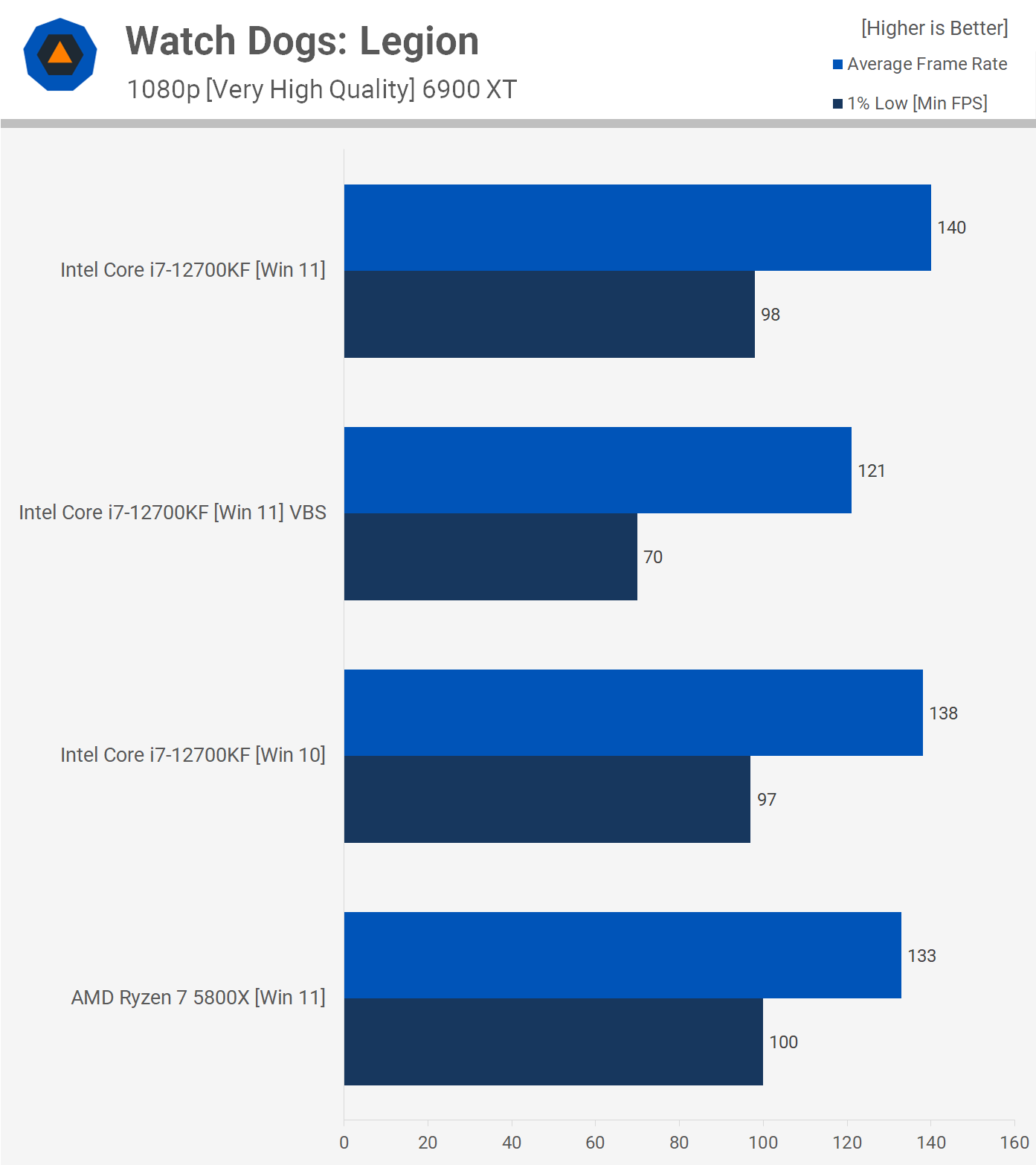 The Watch Dogs: Legion data is shocking, so much so that I went back and re-tested just to be sure. Here we see that Windows 10 and 11 are a match as just seen in Borderlands 3. However, with VBS enabled Windows 11 performance tanks, dropping the average frame rate by 14% and the 1% low by an incredible 29%. We've heard reports of VBS destroying gaming performance by up to 30%, and here's one example of that.