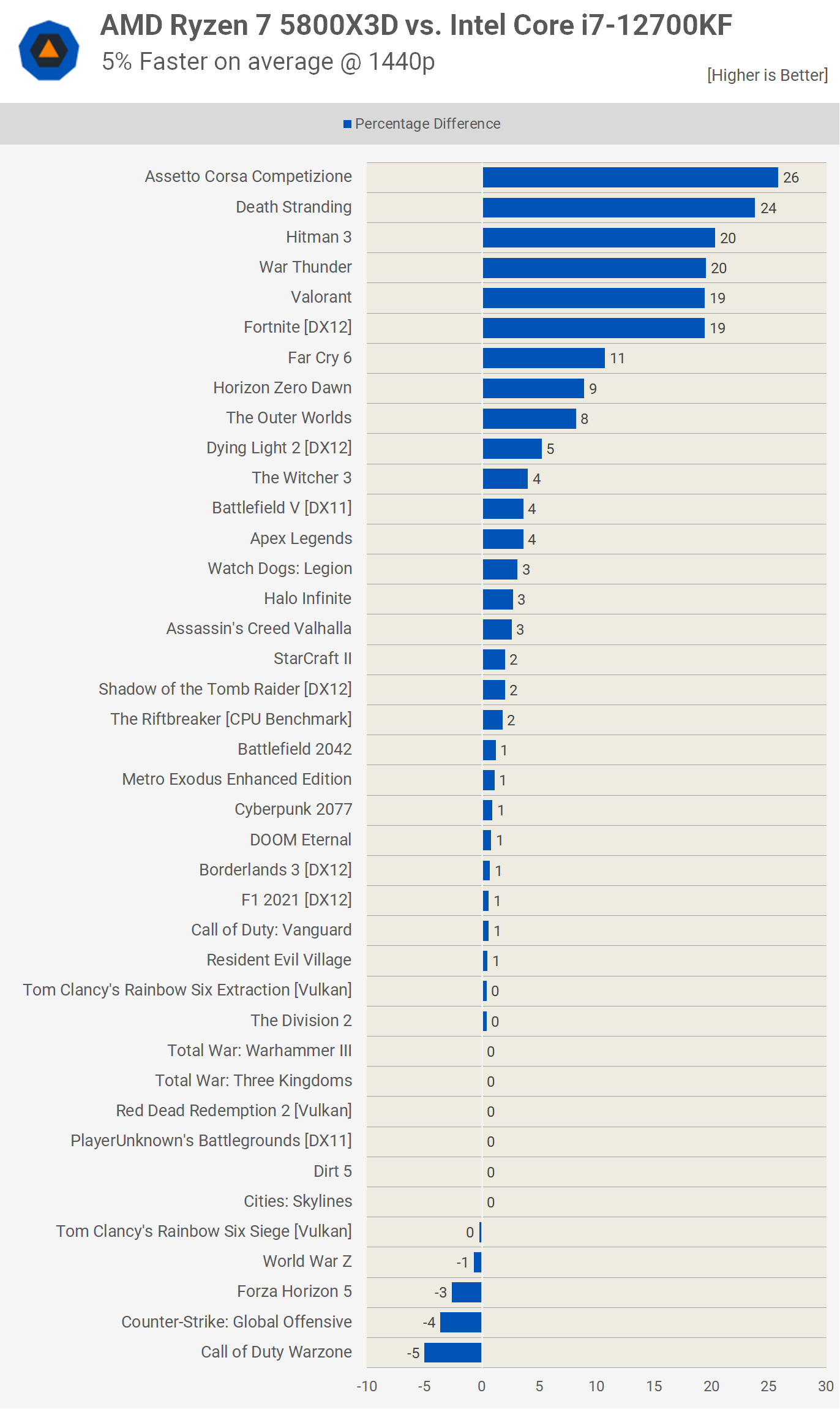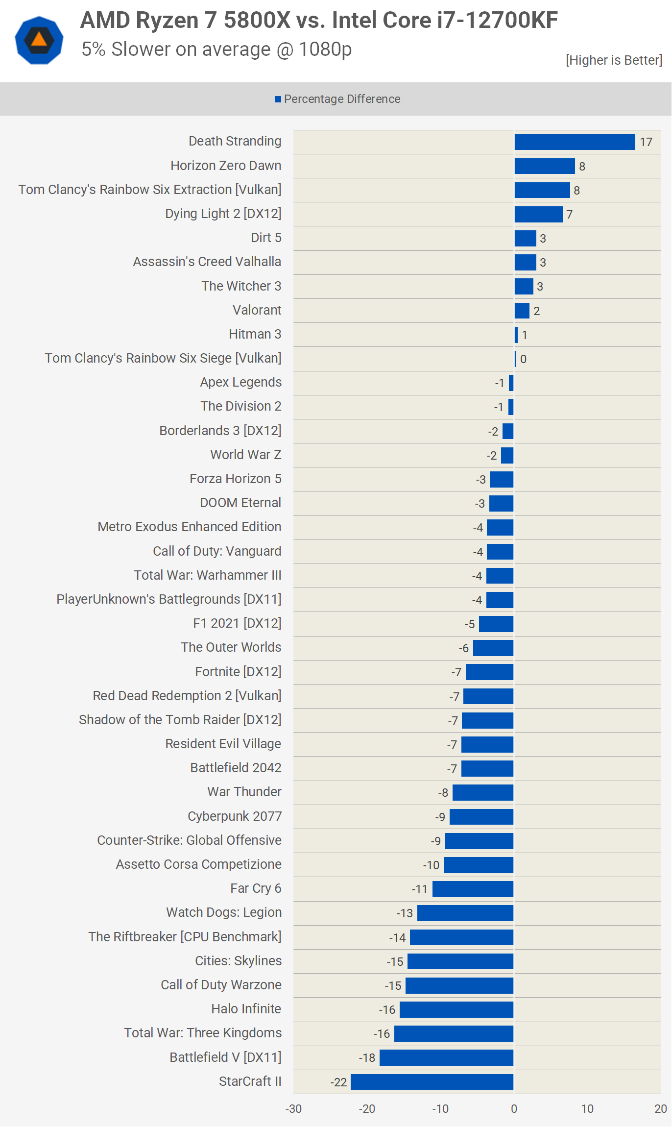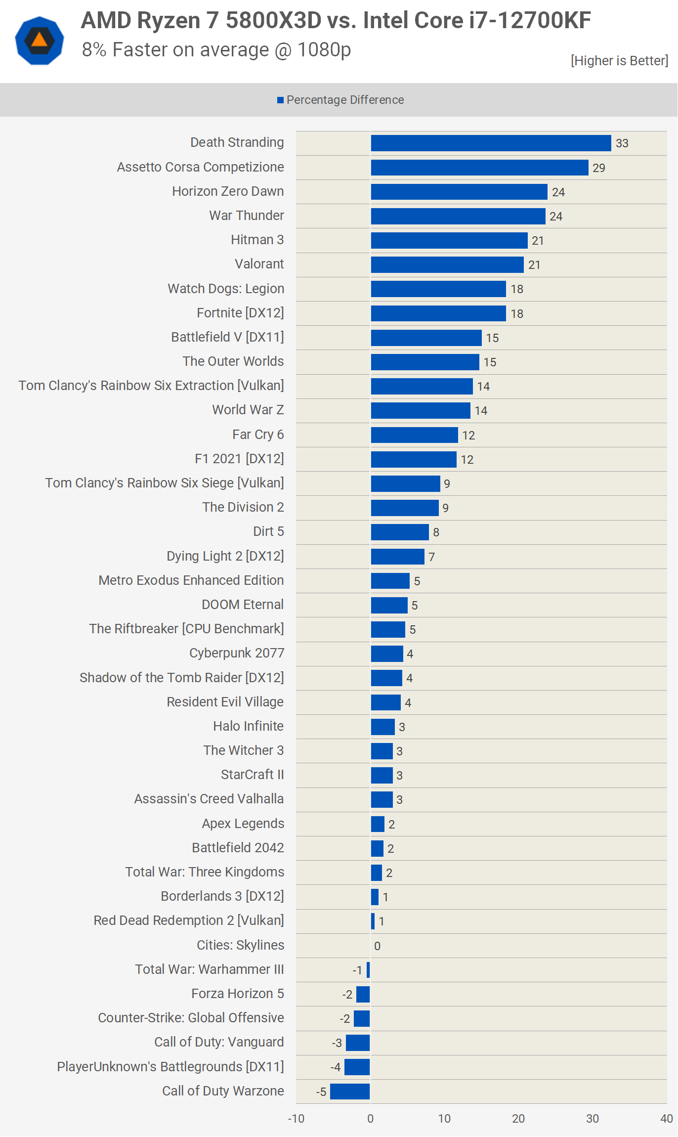 At 1080p, using the GeForce RTX 3090 Ti, the Ryzen 7 5800X3D was just 8% faster than the Core i7-12700KF on average, though it was as much as 33% faster, seen in Death Stranding. There were 14 games where the margin exceeded 10% in favor of the 5800X3D with just a single game where the 5800X3D was slower by a 5% margin or greater.