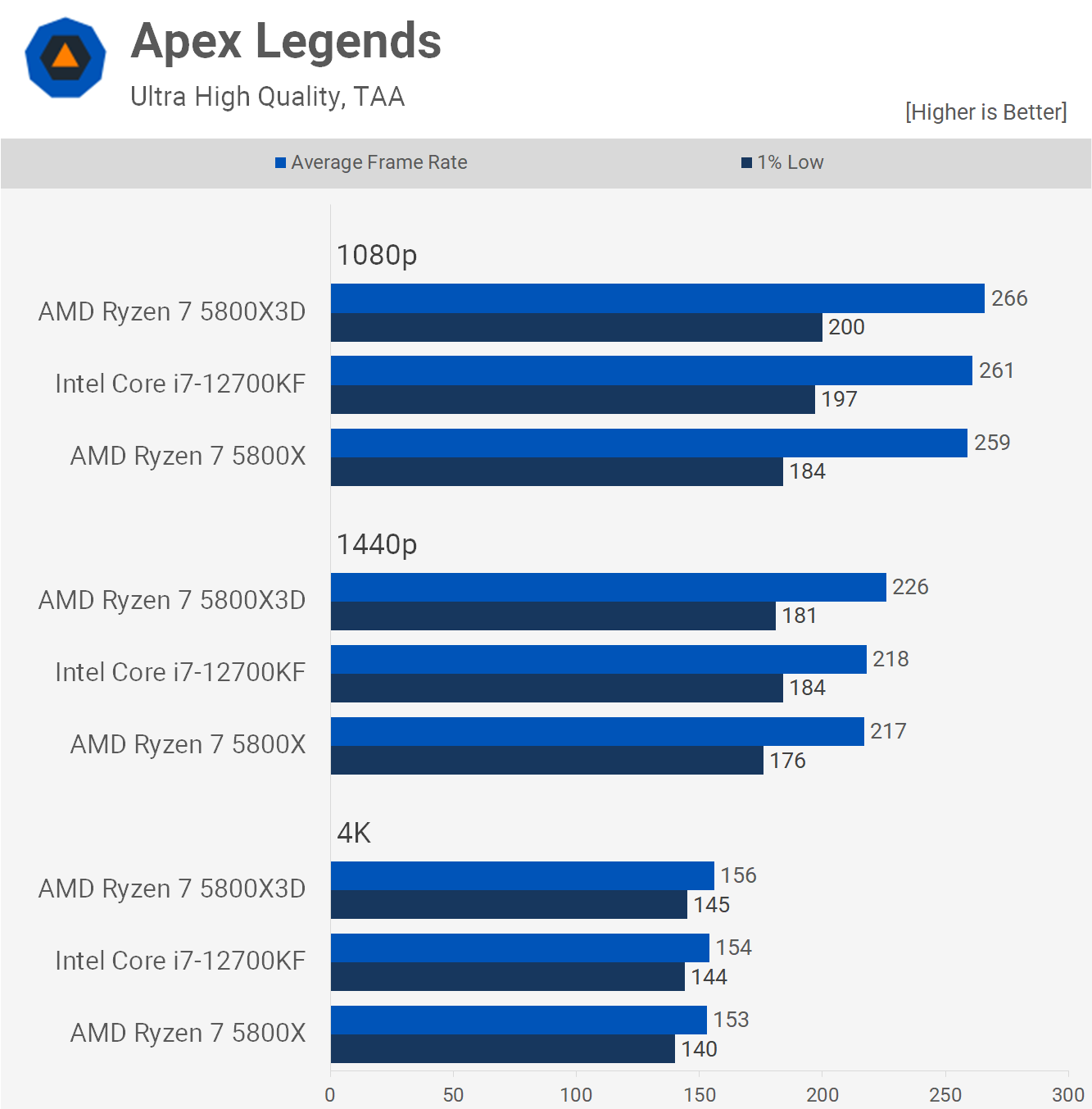 Apex Legends is pretty well GPU limited in our testing with these high-end CPUs as all can drive well over 200 fps at 1080p using the RTX 3090 Ti. The 12700KF does appear to sit between the two Ryzen 7 processors and if you require no more than 260 fps on average, then any of these CPUs will work just fine.