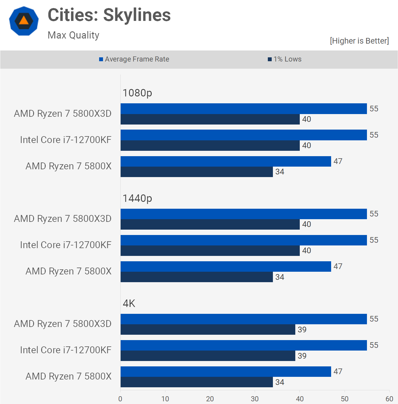Interesting testing with Cities Skylines sees the 12700KF matching the 5800X3D, making it 18% faster than the standard 5800X. A solid result here for the Core i7 part, more so when you consider how much cheaper it is than the 3D model.