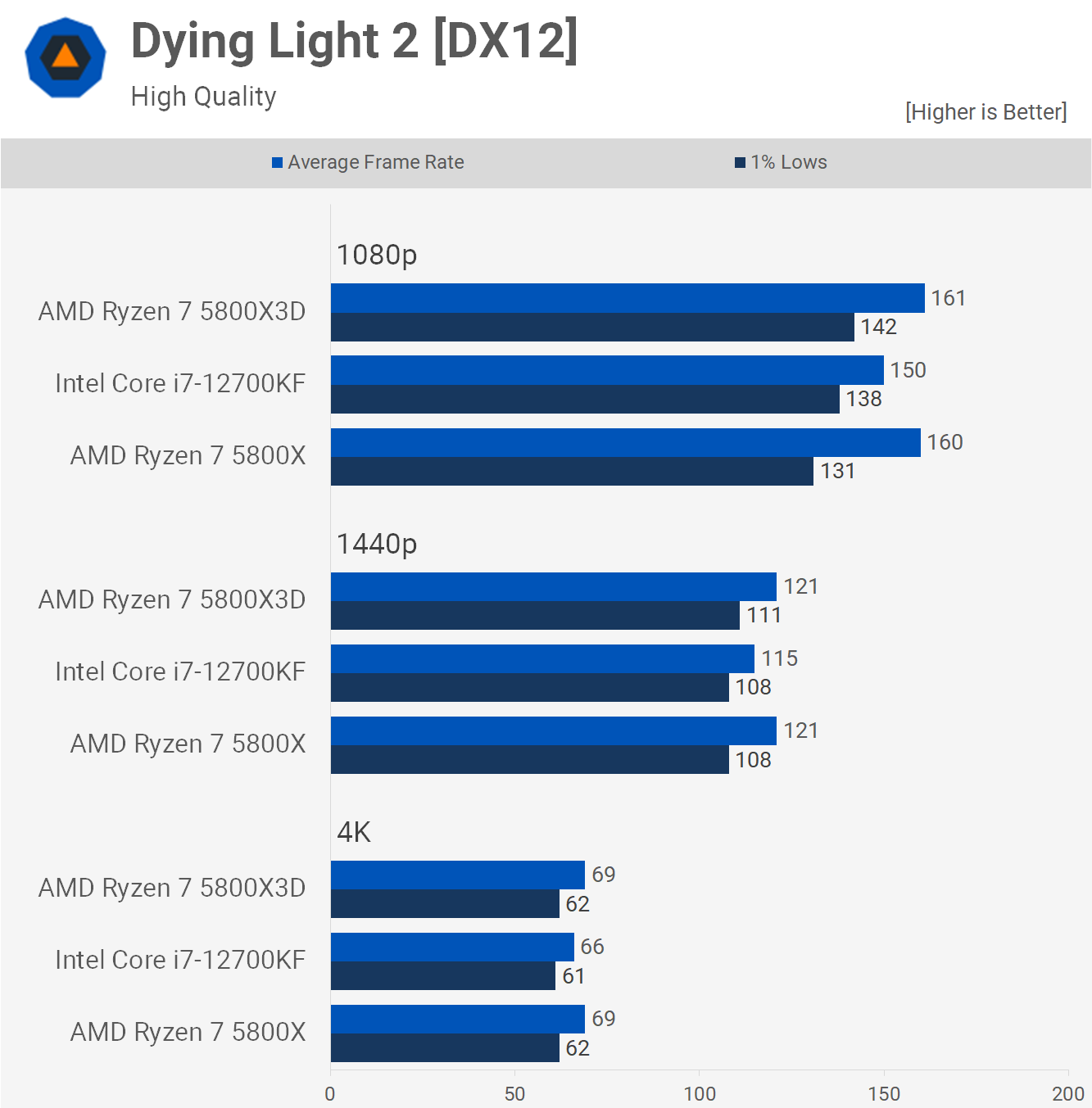 Dying Light 2 isn't exactly a CPU heavy game and as an action role-playing, survival horror it doesn't exactly require hundreds of frames per second, so 160 fps at 1080p is probably enough and it was certainly enough to match the 5800X3D, though the 1% lows were 8% lower. Still comparable performance overall.