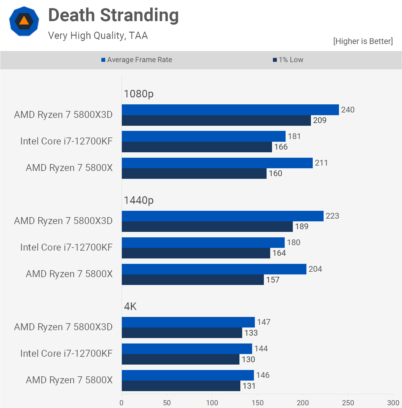Last up we have Death Stranding and here the Intel CPUs behave quite oddly, delivering relatively strong 1% low performance with weak average frame rate performance. As a result the 12700KF was 4% faster than the 5800X at 1080p when looking at 1% lows, but 14% slower for the average frame rate. This meant the 5800X3D was up to 31% faster than the Core i7 processor. Of course, this is a single player game, so pumping out over 160 fps in our testing at 1080p is likely more than sufficient for this title.