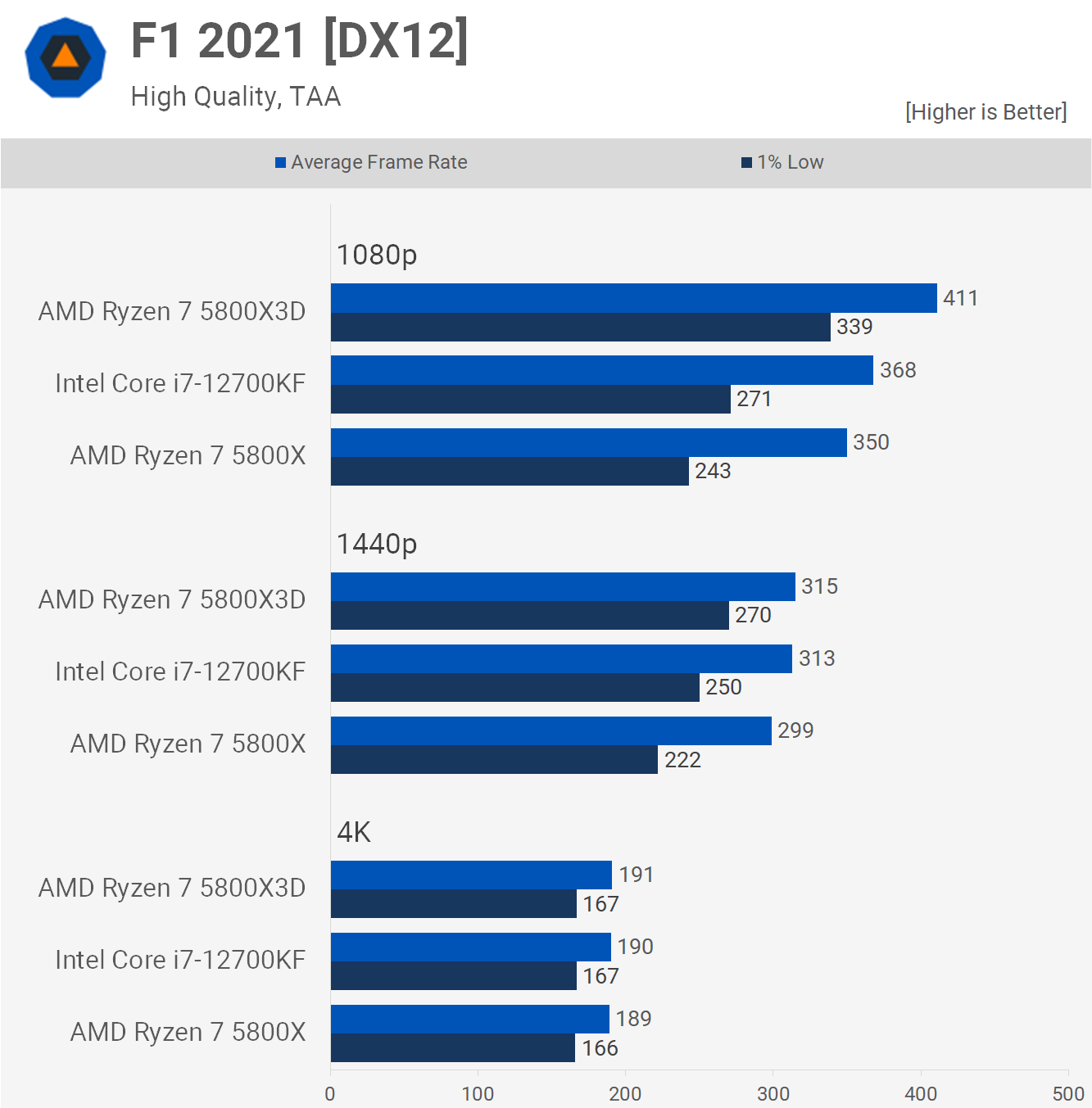 Next we have F1 2021, where the 12700KF finds itself between the 5800X and 5800X3D once again, though it is closer to the non-3D model, beating it by a 12% margin for the 1% lows at 1080p while it was 20% slower than the 5800X3D. While slower than the V-Cache enabled model, all CPUs pushed well over 200 fps.