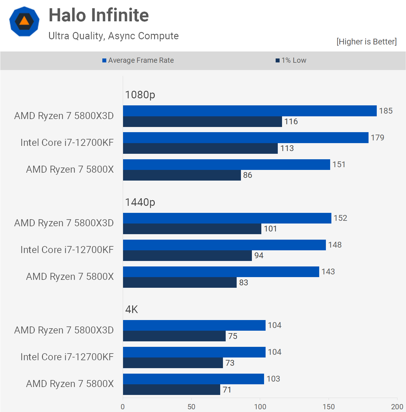 Halo Infinite does play better on the 12700KF opposed to the 5800X, we're looking at a massive 31% increase in 1% lows at 1080p, allowing the Core i7 processor to roughly match the 5800X3D, so a good result for Intel.