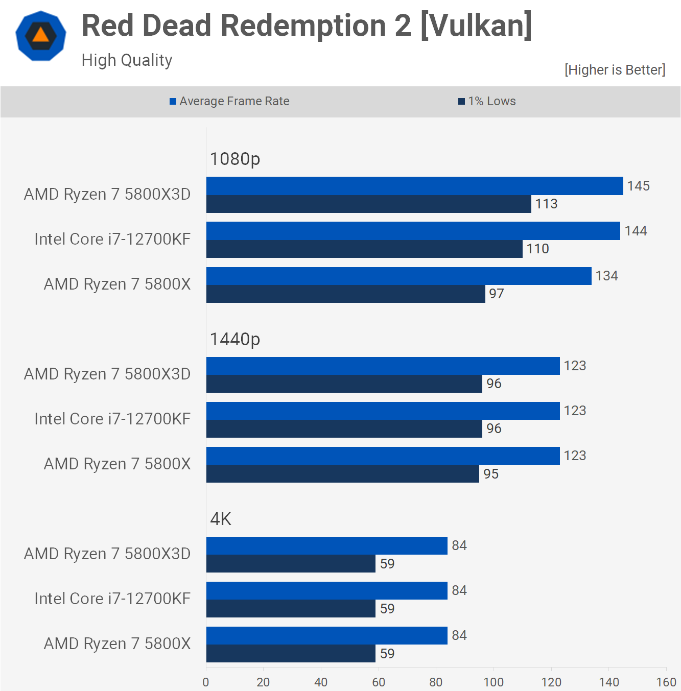 The 12700KF also matched the 5800X3D in Red Dead Redemption 2 at 1080p before becoming entirely GPU limited at 1440p and 4K. We're looking at a 13% improvement in 1% lows at 1080p, making the Core i7 processor just 3% slower than the 5800X3D.
