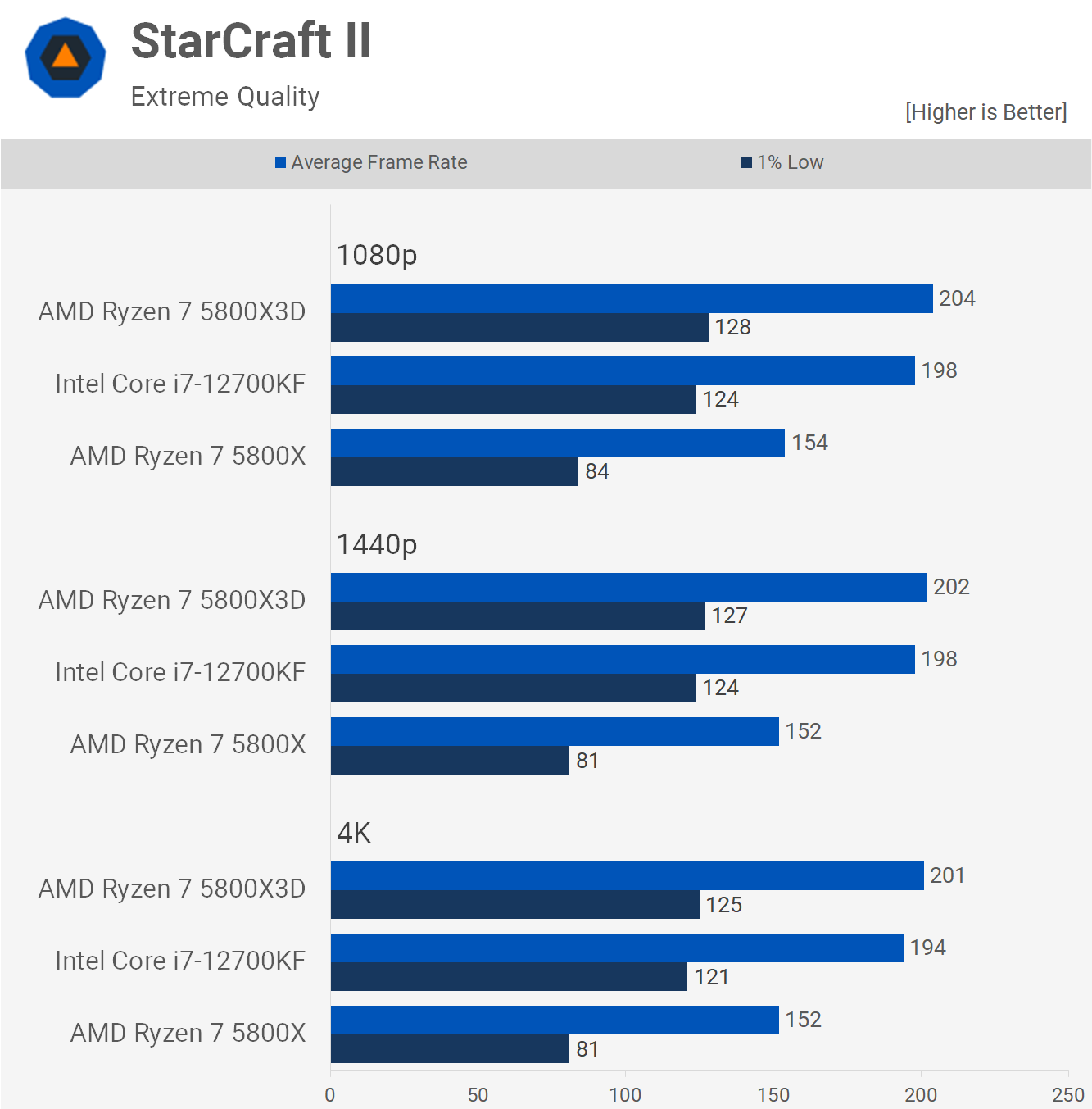Another game where the 12700KF performs really well is StarCraft II where it basically matched the 5800X3D, which is impressive given the 3D version was over 50% faster than the standard model.