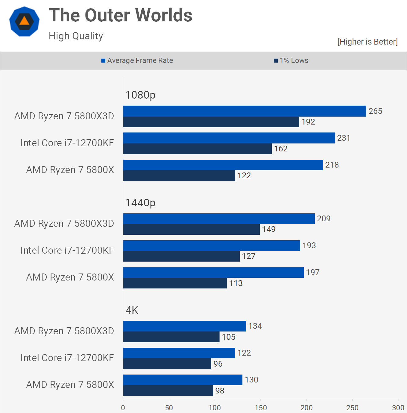 The second last game that we're going to look at is The Outer Worlds and this is one where the 5800X3D was up to 57% faster than the 5800X. The 12700KF is much faster than the 5800X, but even so the 5800X3D still managed to boost 1% lows by 19% at 1080p and was even up to 17% faster at 1440p.