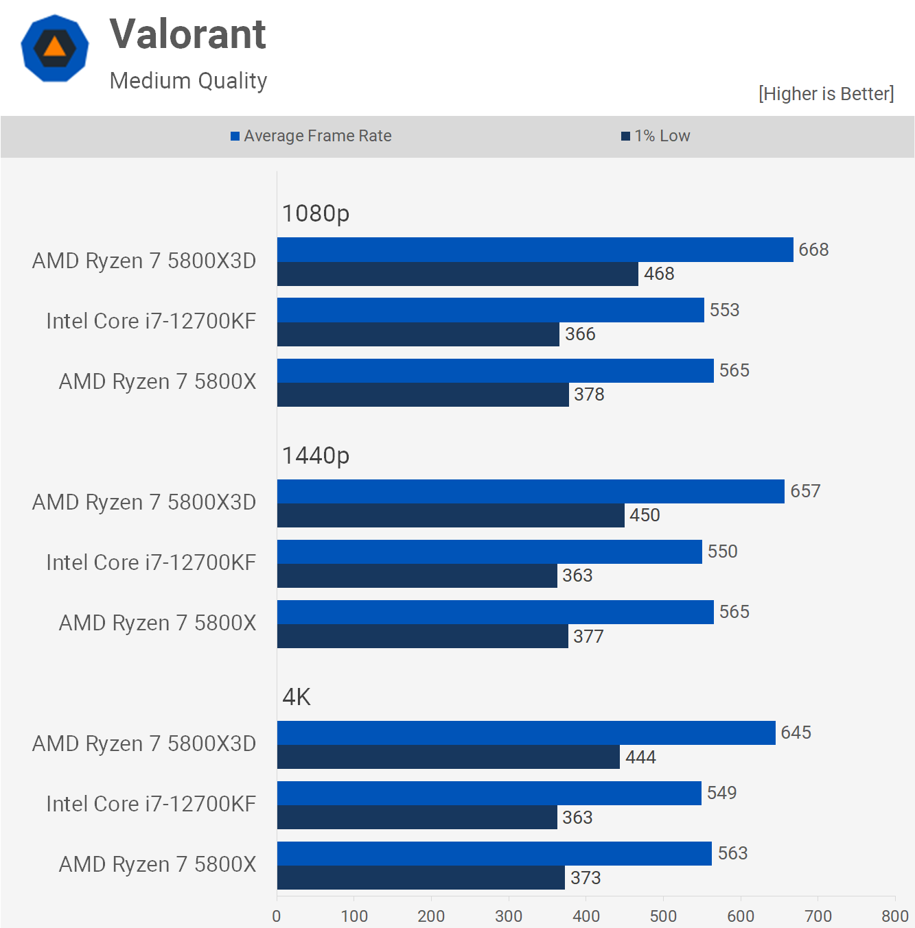 Starting with Valorant, we see that the 5800X and 12700KF are evenly matched, with the original Ryzen 7 CPU only winning by a few percent. That being the case, the 5800X3D was up to 28% faster at 1080p when looking at the 1% lows and even at 4K maintained a 22% margin. A clear win for the 5800X3D, though we're not sure how many of you will notice the difference, but I'll leave that up to the pro gamers amongst you to decide.