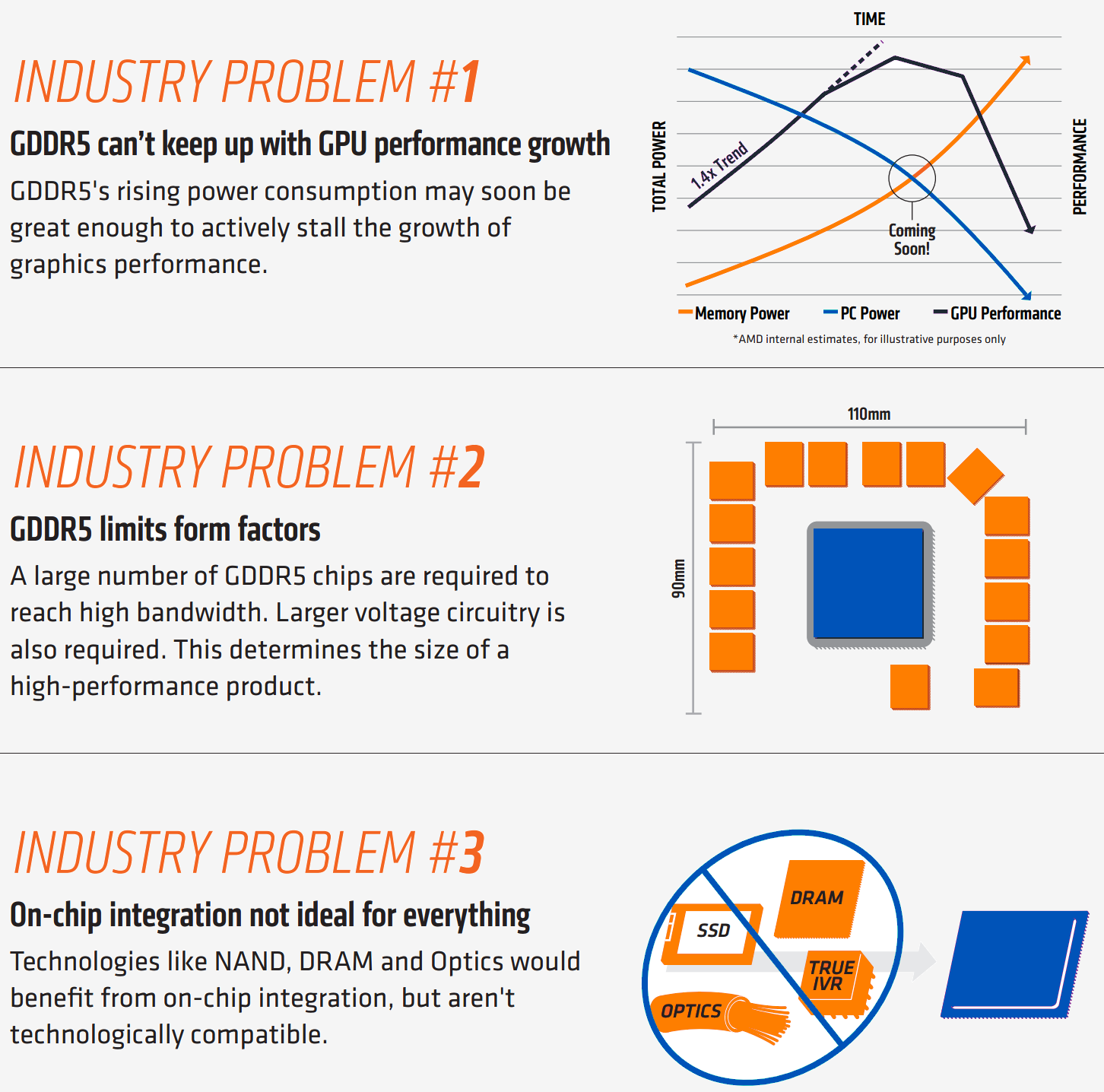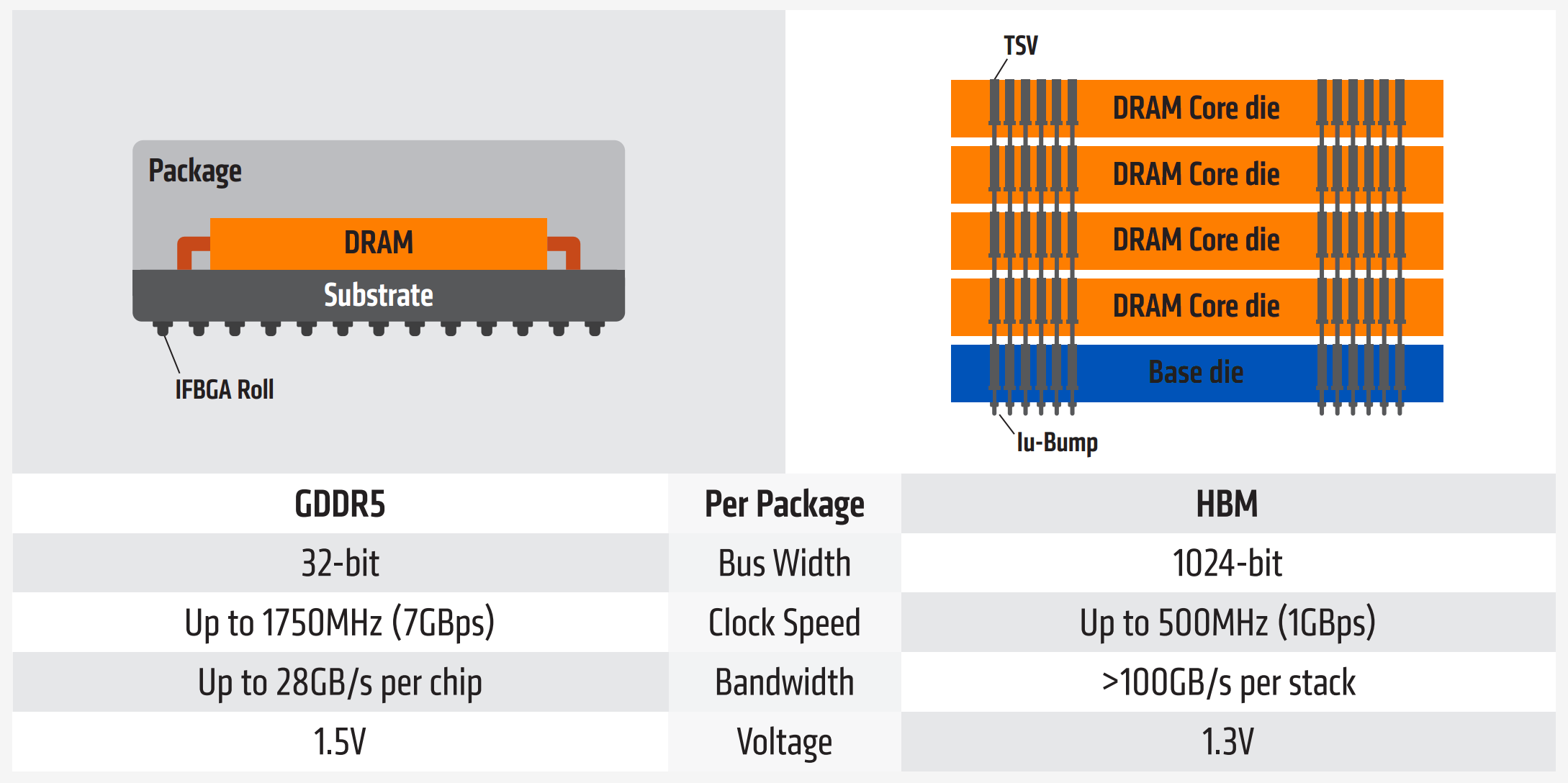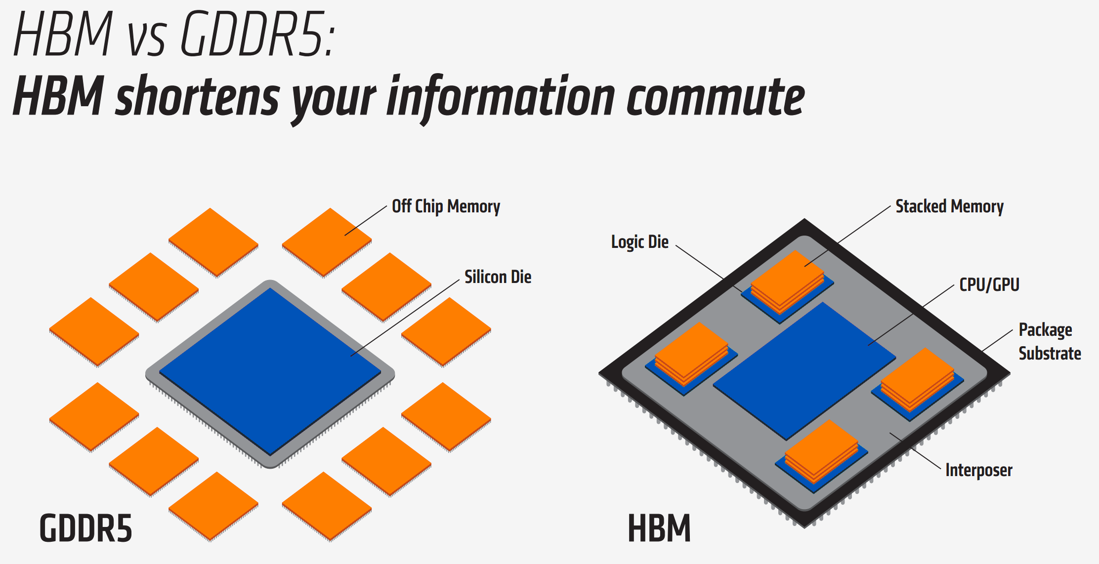 HBM is a superior technology to GDDR5 by almost every memory metric, offering more bandwidth while using less power and 19x less surface area than GDDR5.