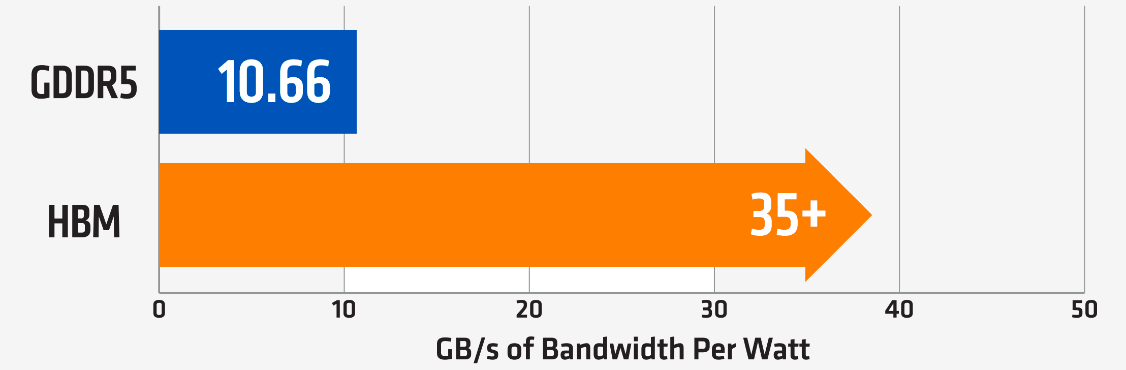 This means HBM comes at a cost of a little over 35GB/s per watt while GDDR5 offers just 10.6GB/s per watt.