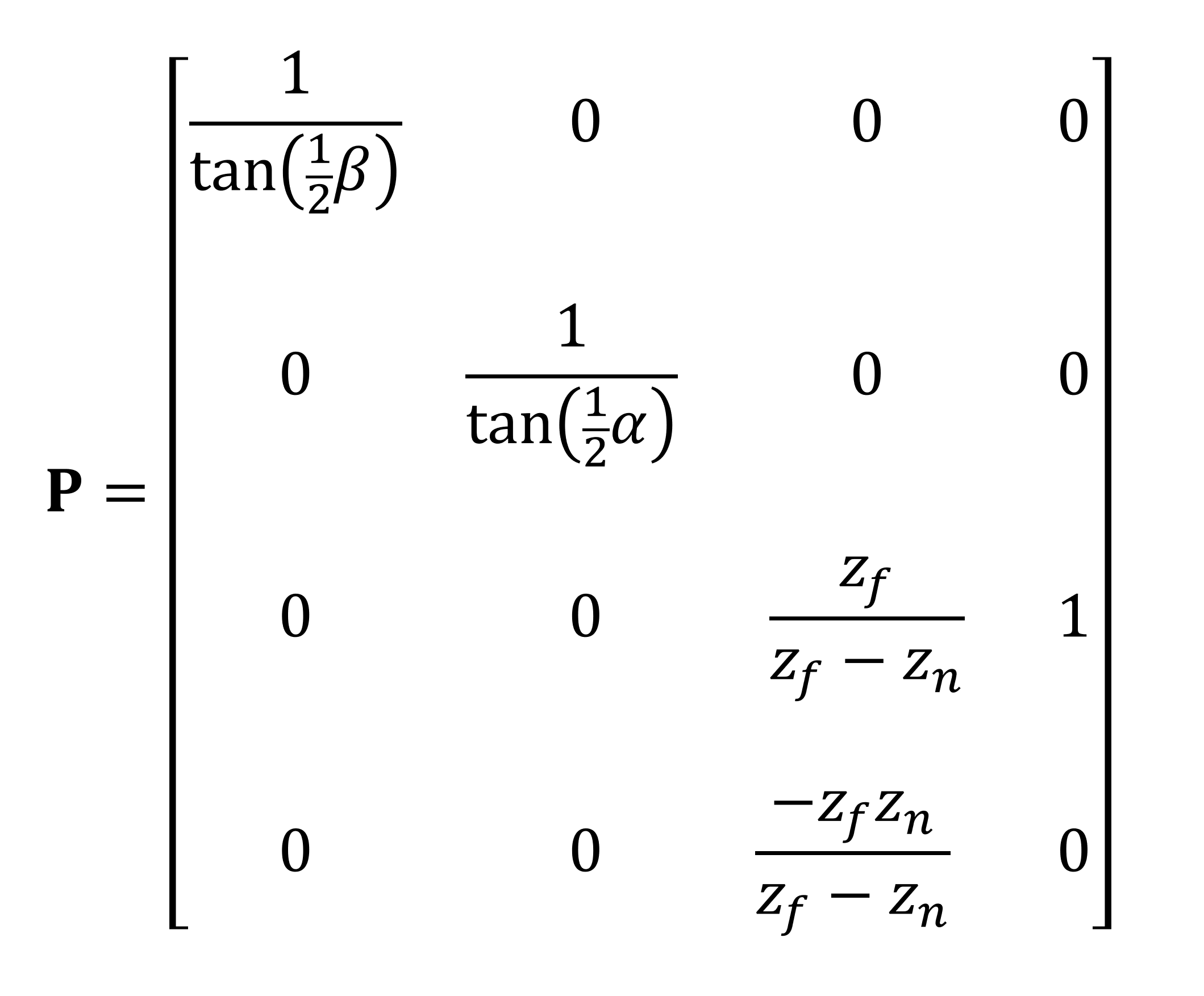 The transformation is done by use of another matrix – this particular one is called the perspective projection matrix. In our example below, we're using the field of view angles and the positions of the clipping planes to do the transformation; we could use the dimensions of the viewport instead though.