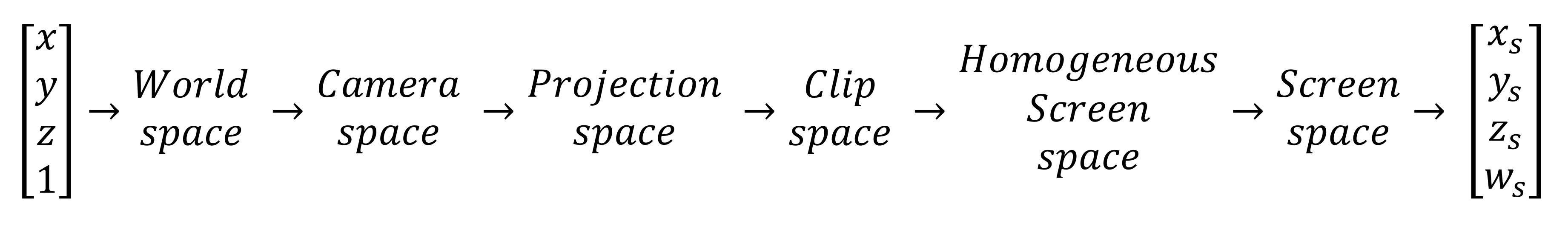 Left to right: World space > Camera Space > Projection Space > Screen Space