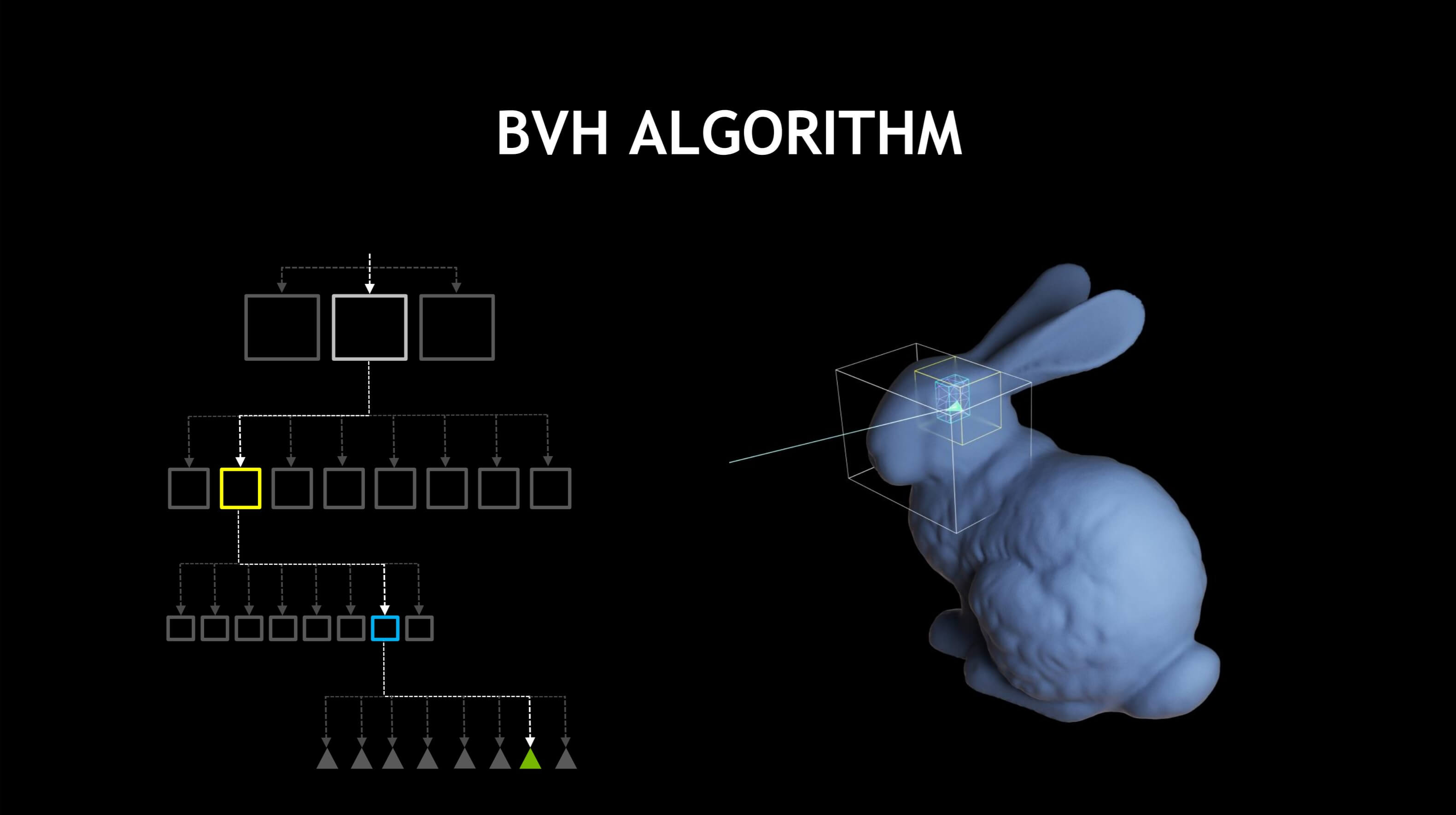 For example, the first BV would be for the whole rabbit. The next couple would cover its head, legs, torso, tail, etc.; each one of these would then be another collection of volumes for the smaller structures in the head, etc., with the final level of volumes containing a small number of triangles to test. All of these volumes are then arranged in an ordered list (called a BV hierarchy or BVH for short) such that the system checks a relatively small number of BVs each time: