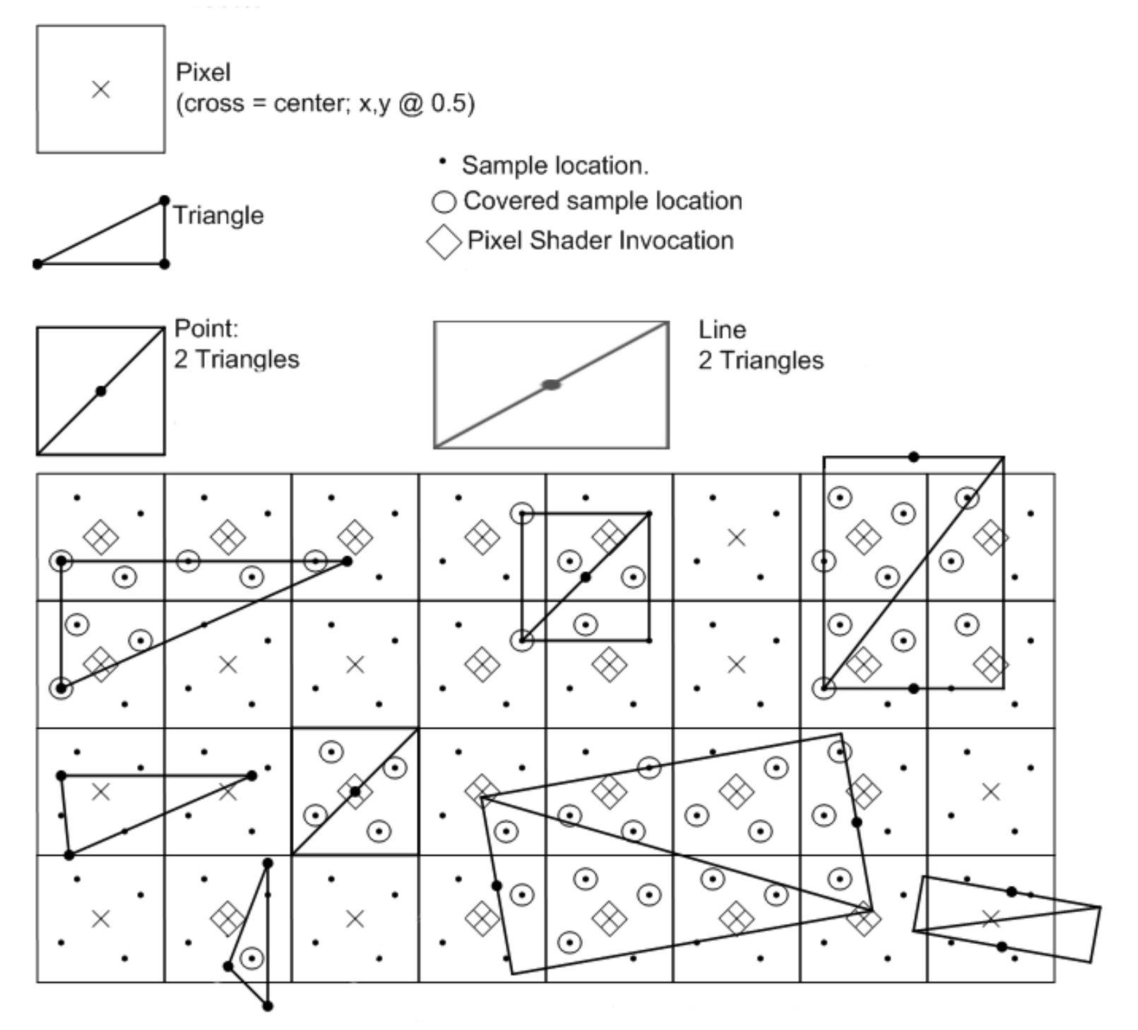 Next, it's time to start applying the pixel grid. Again, this is surprisingly complex, because the system has to work out if a pixel fits inside a primitive – either completely, partially, or not at all. To do this, a process called coverage testing is done. The image below shows how triangles are rasterized in Direct3D 11: