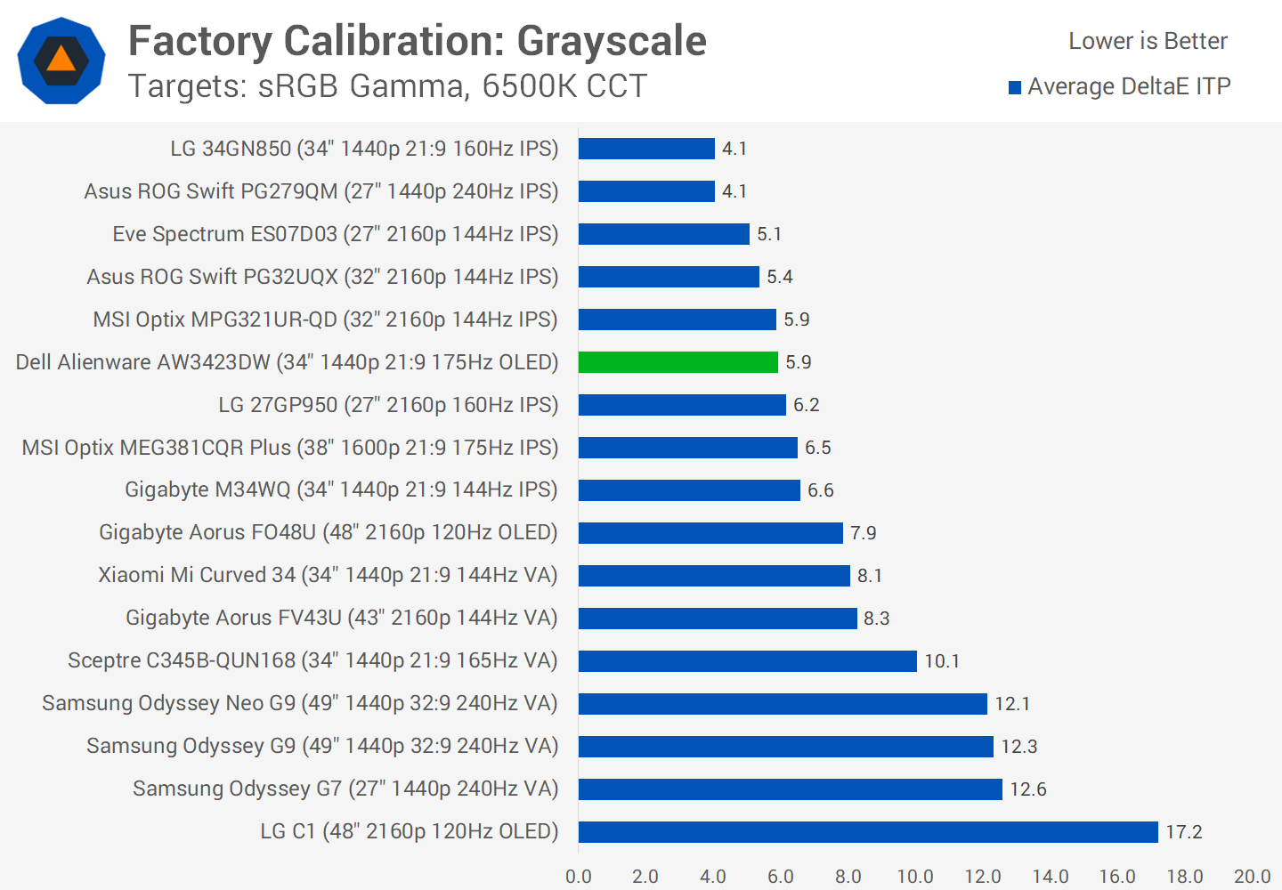 Relative to other monitors, grayscale performance isn't the worst thanks to strong CCT performance, but could have been elite with some attention to gamma. As expected ColorChecker calibration puts it in the lower part of the table due to saturation issues.
