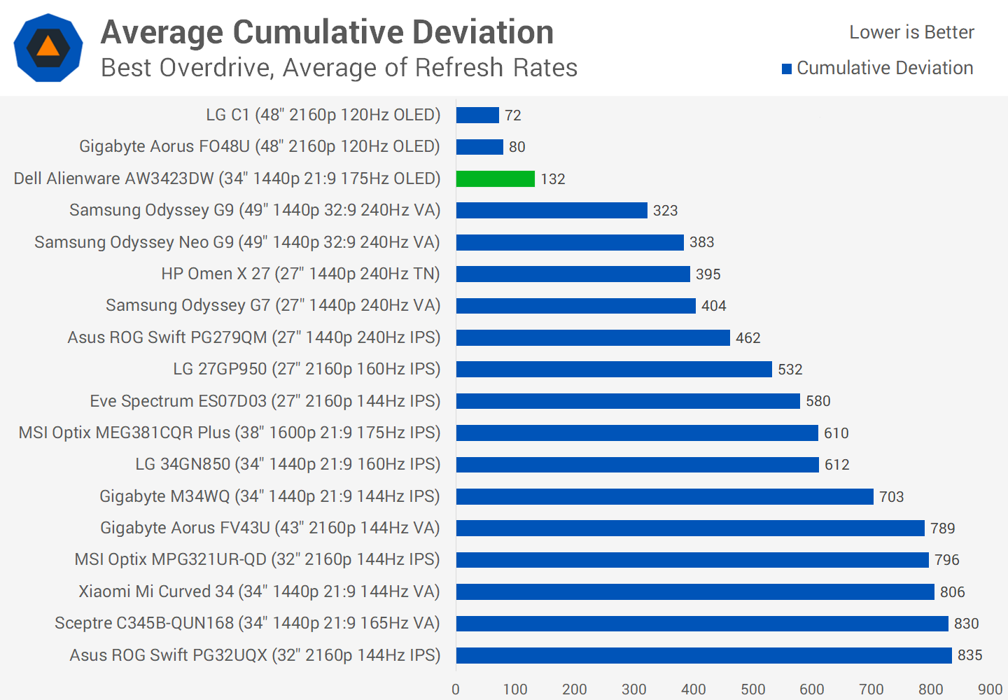 The cumulative deviation numbers are perhaps the most interesting. Despite the QD-OLED response time numbers being equivalent to what we see from LG WOLED panels such as the LG C1 and Gigabyte FO48U, the QD-OLED panel ends up behind in cumulative deviation. This is because the response curves are different. WOLED has a quicker initial response in the first half of the transition, which accounts for most of this difference. But regardless of which OLED tech you get, the results are significantly superior to anything LCD based.