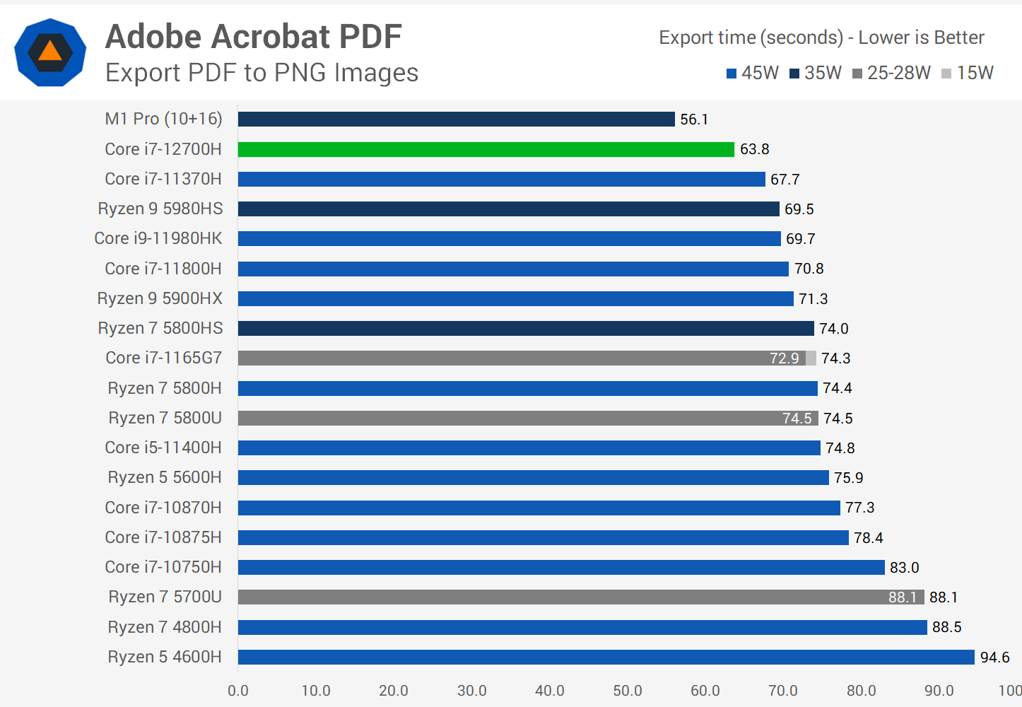 Acrobat PDF exporting benefits from improved single-thread performance on the P-cores, coming in 11 percent faster than the 11800H. This keeps Intel in the lead over AMD in this workload, however both chips are still beaten by the Apple M1 Pro which is excellent in this test despite using emulation.