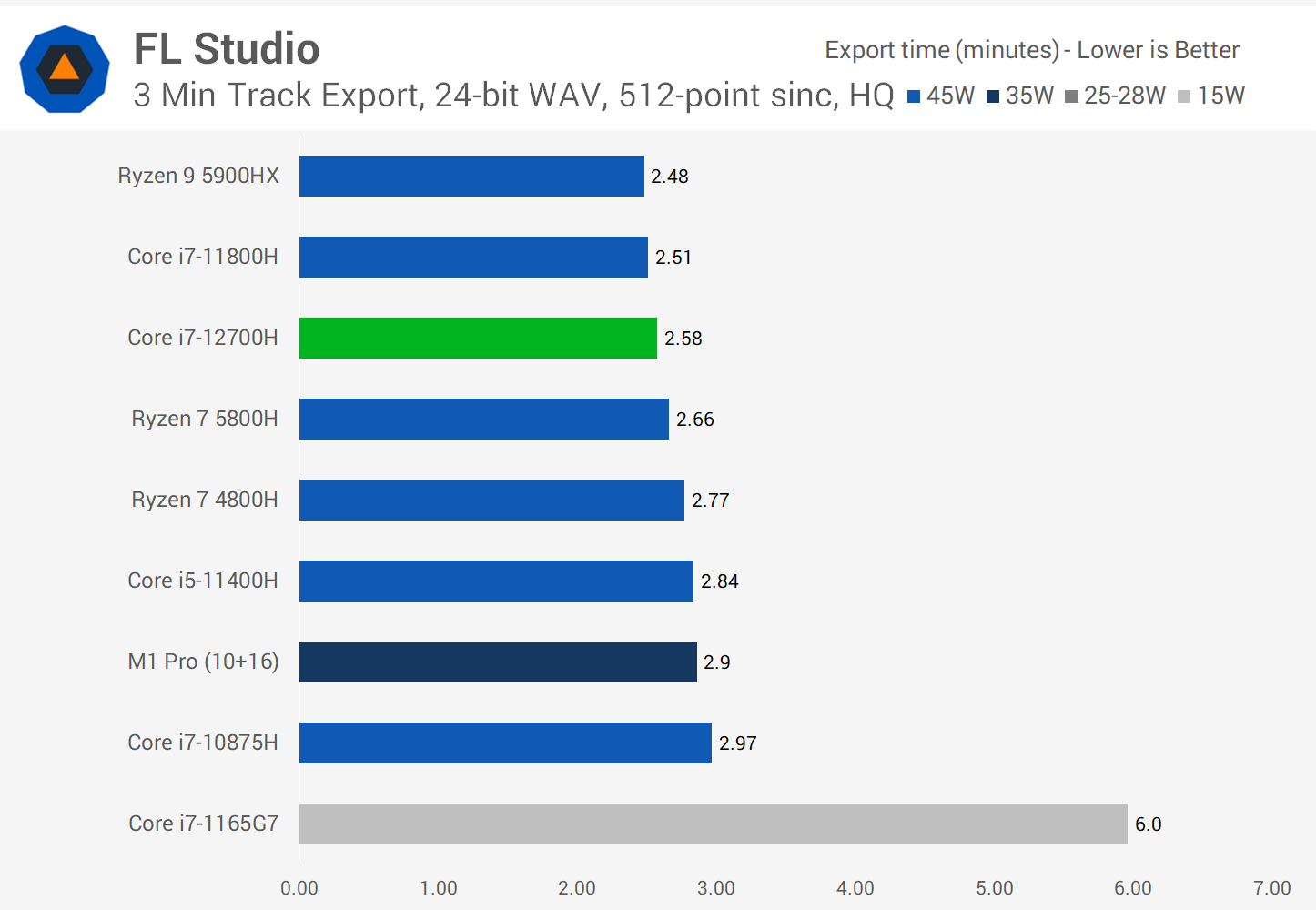 On the other hand, Alder Lake doesn't outperform older processors in FL Studio. While the CPU still performs well exporting a track and does utilize both P-cores and E-cores, I suspect the E-cores are a bit of a hindrance here given the performance difference vs the P-cores (and audio workloads are highly sensitive, so this could be an explanation for what we're seeing).