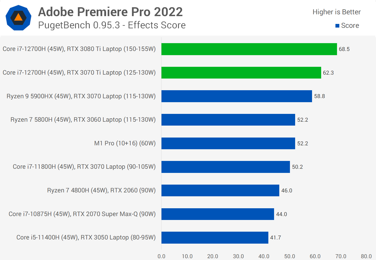 The other thing I wanted to show your is the Effects score, not as much of a dominant lead here, but when using effects in Premiere, the 12700H configurations are the best you can get right now.