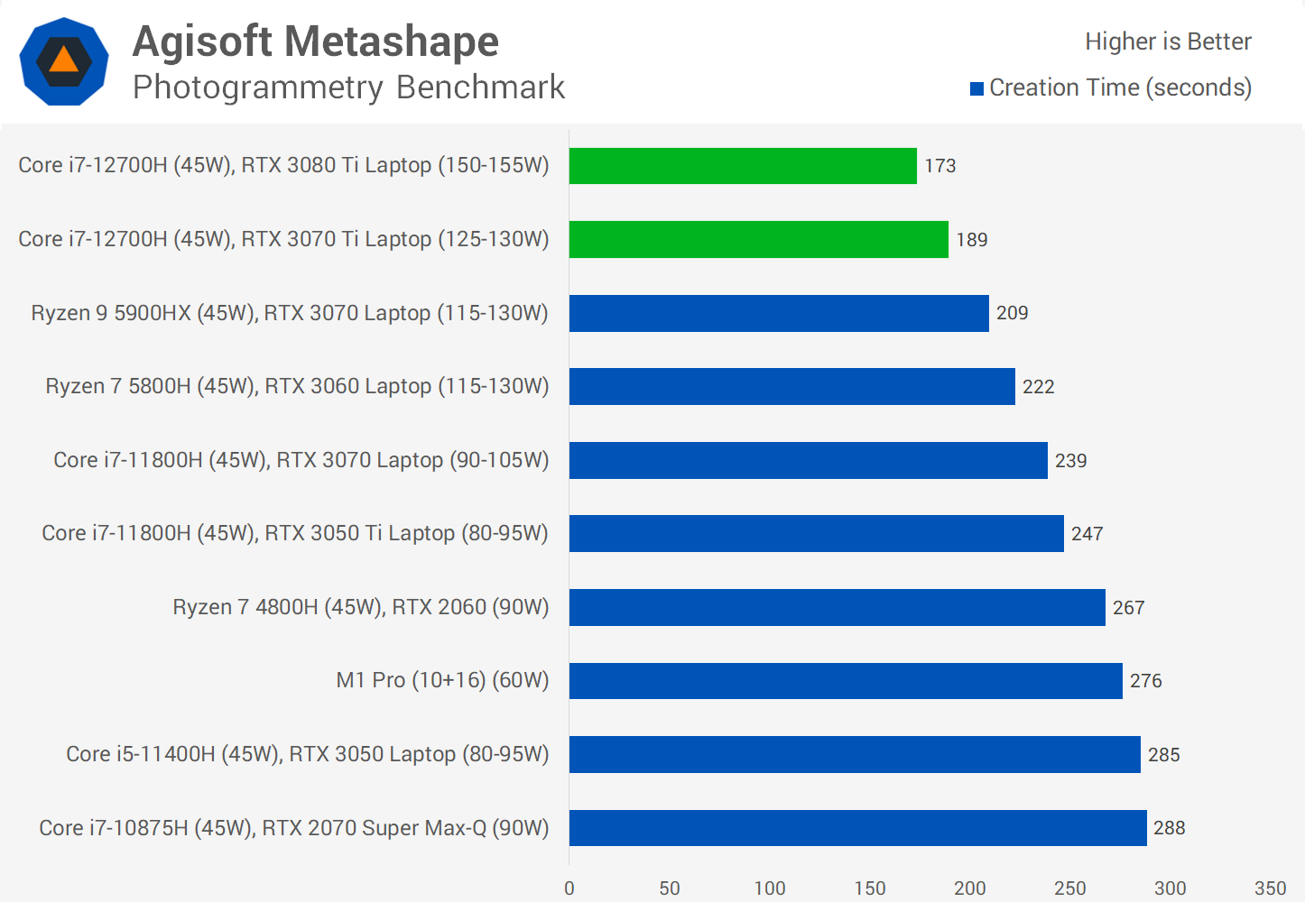 Part of that comes down to the export score. The full performance available with these new laptop configurations is 25% faster than a previous-gen configuration, comparing 12700H + 3070 Ti, to 11800H + 3070.