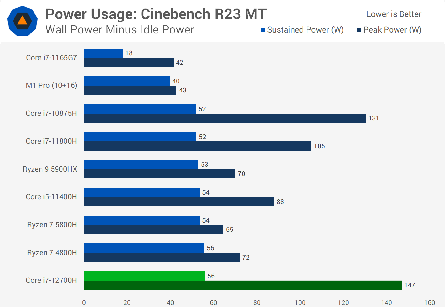 When it comes to actual power draw from the wall, when the x86 CPUs are limited to 45W the 12700H has among the highest actual power usage, a few watts higher than the 11800H.
