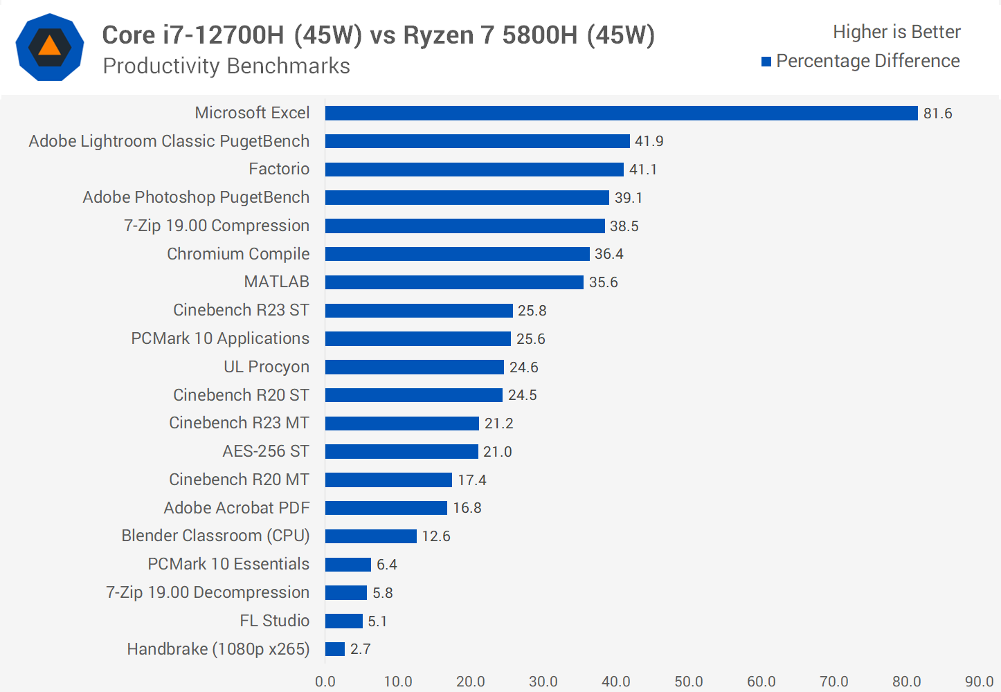 For basic tasks like app loading, video conferencing and so on, the Core i7-12700H is a great option and it's able to outperform the Ryzen 9 5900HX, though only by a single digit margin. Most of today's laptops are fast enough for these sorts of workloads.