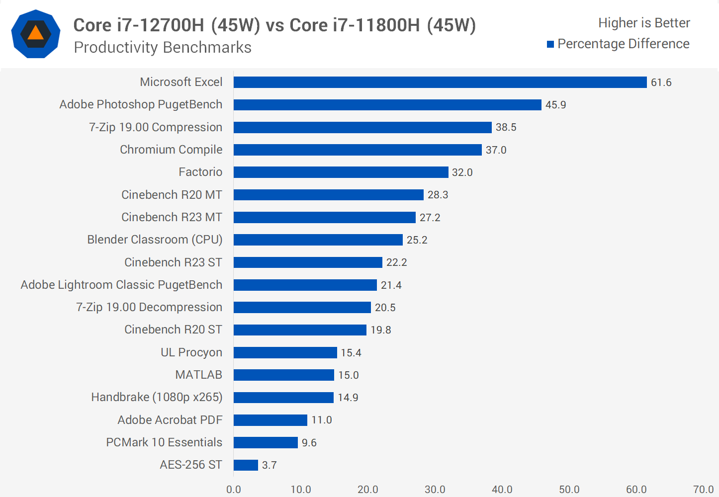 Compared to Intel's previous Core i7 model, the 11800H, we're looking at 20-30% higher performance at the default 45W power level in productivity apps, and 30-40% better performance in the higher 75W power configuration that some OEMs use.